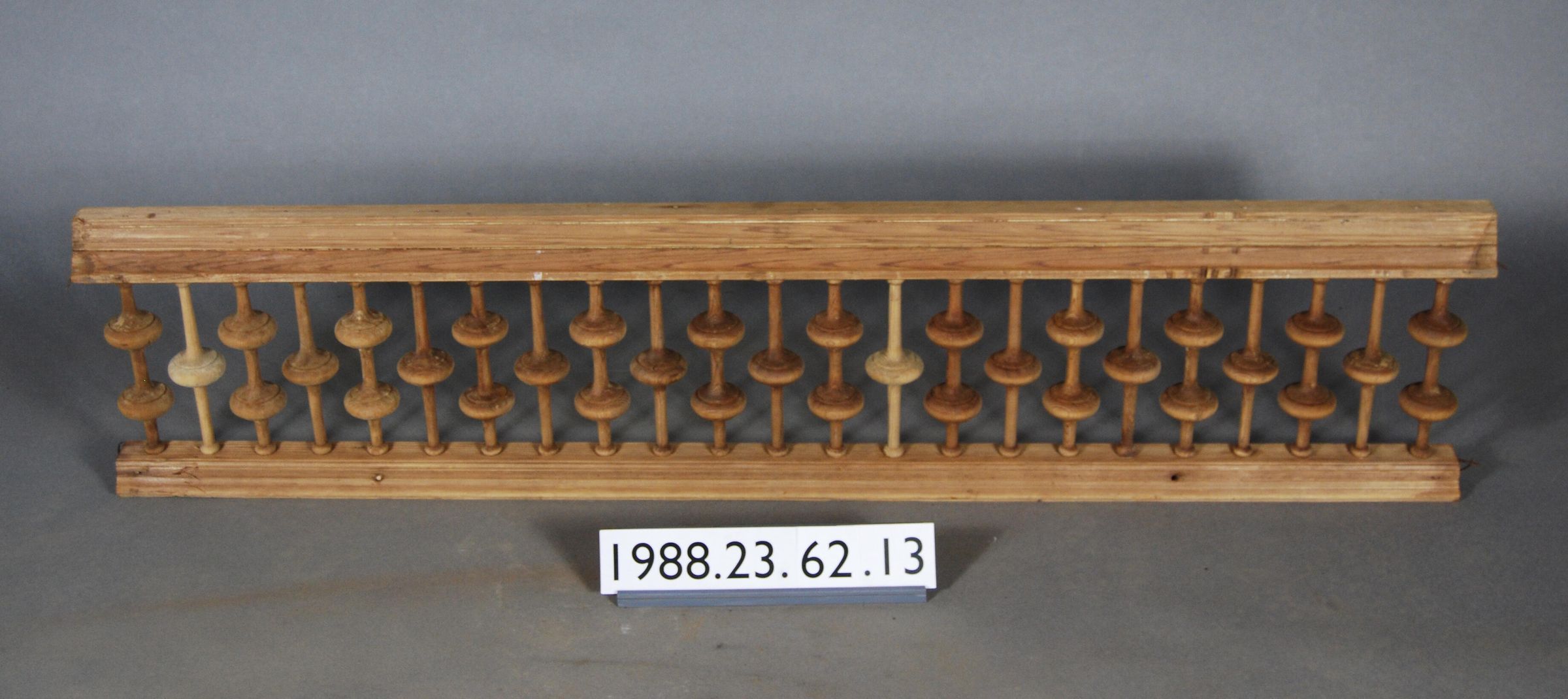 Exterior wood spindle work composed of curved top and bottom rails and twenty-three turned spindles. Originally painted - now stripped. Manufacturer: Place of Manufacturer: Design motif: Style: Finish: Stripped