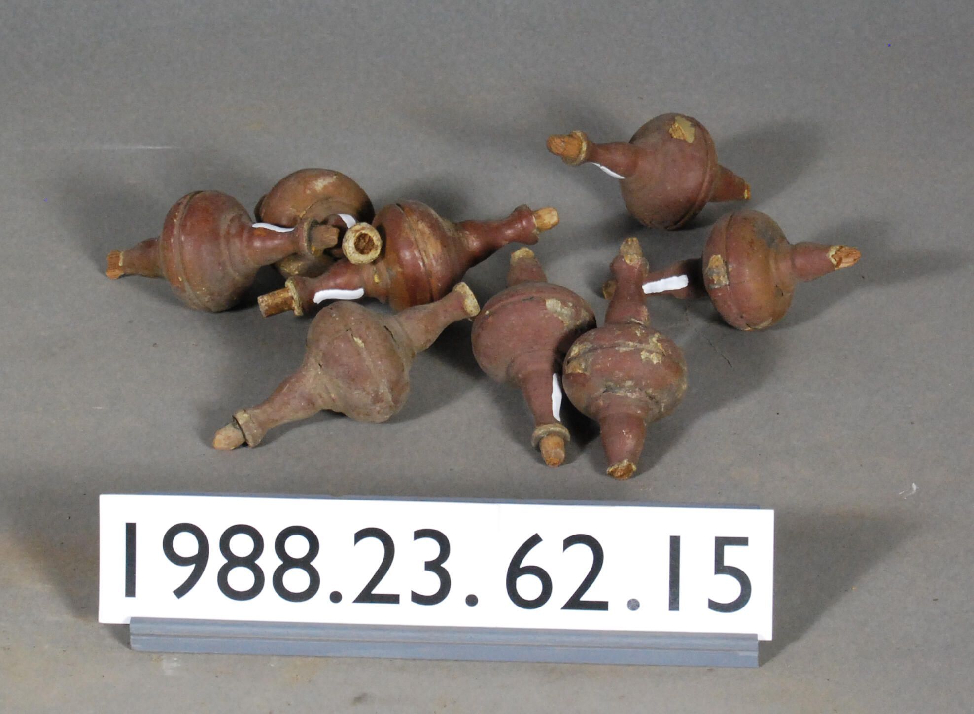 One lot of eight exterior wood turned wood spindles. Painted dark reddish brown. Six of the total are truncated or damaged. Part of porch assembly. Manufacturer: Place of Manufacturer: Design motif: Style: Finish: Painted