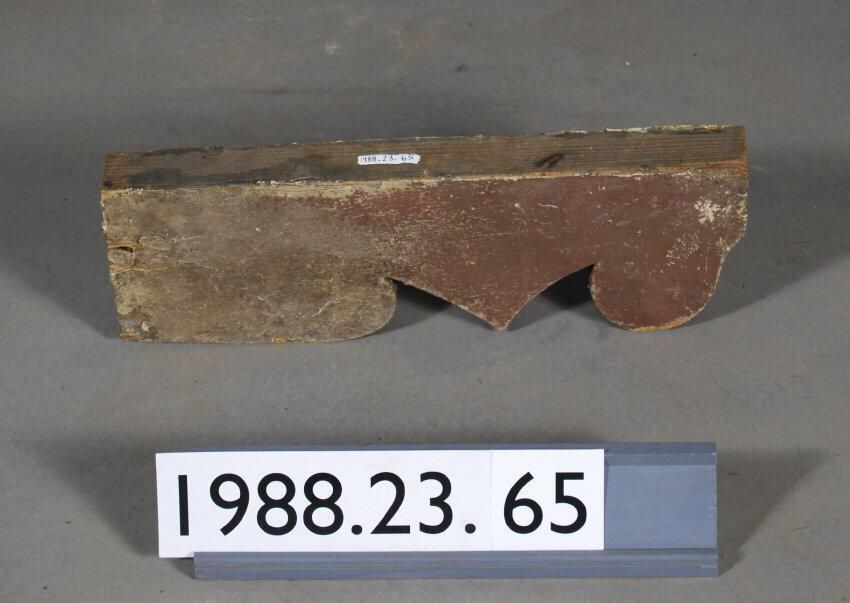 Exterior wood architectural ornament. Flat lumber with fret-work cut-out. Possibly rafter tail? Painted dark reddish brown.