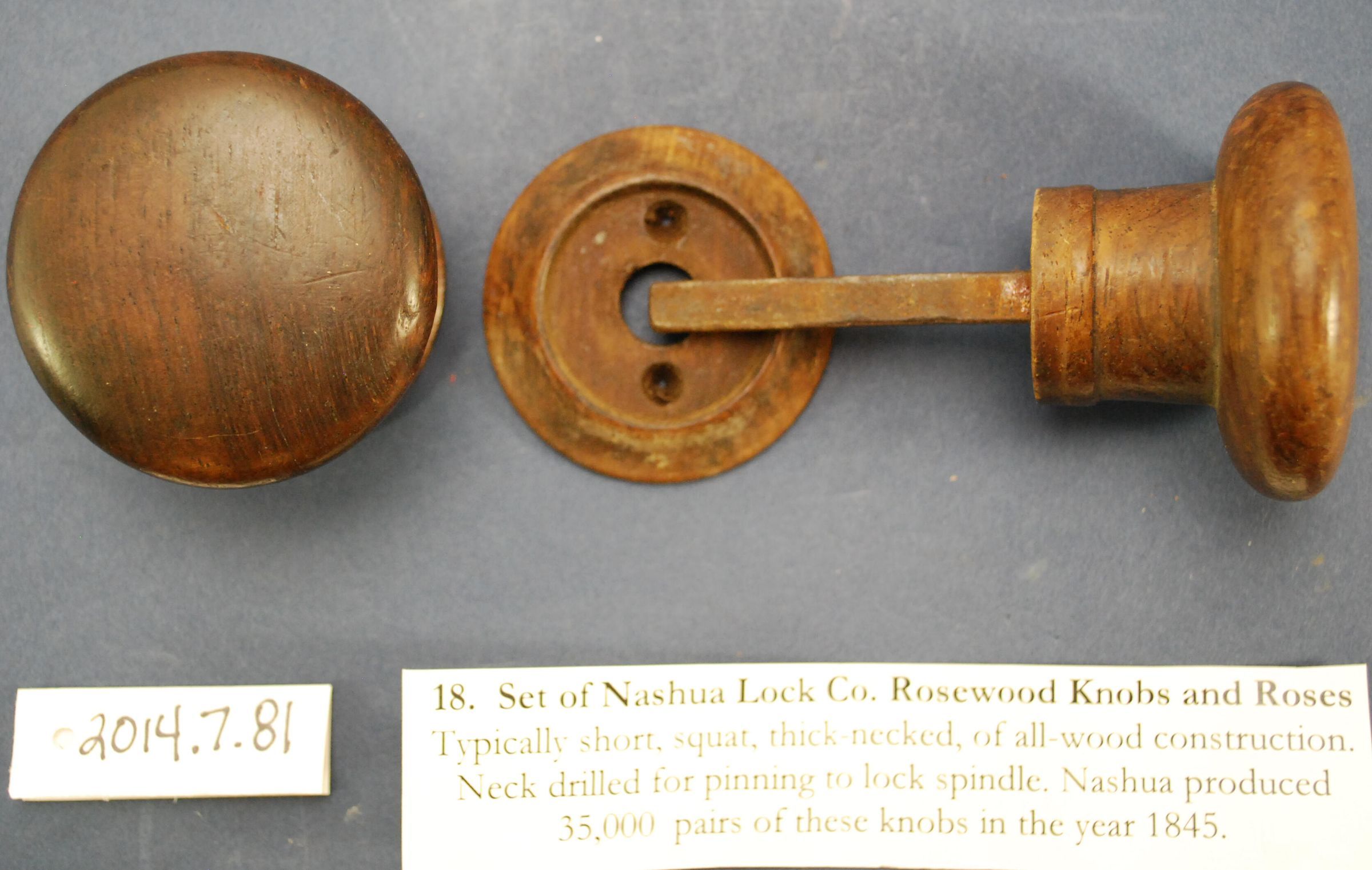 Comments: Probably rosewood. Pair of doorknobs,spindle, and pair of rose escutcheons.Lexicon
