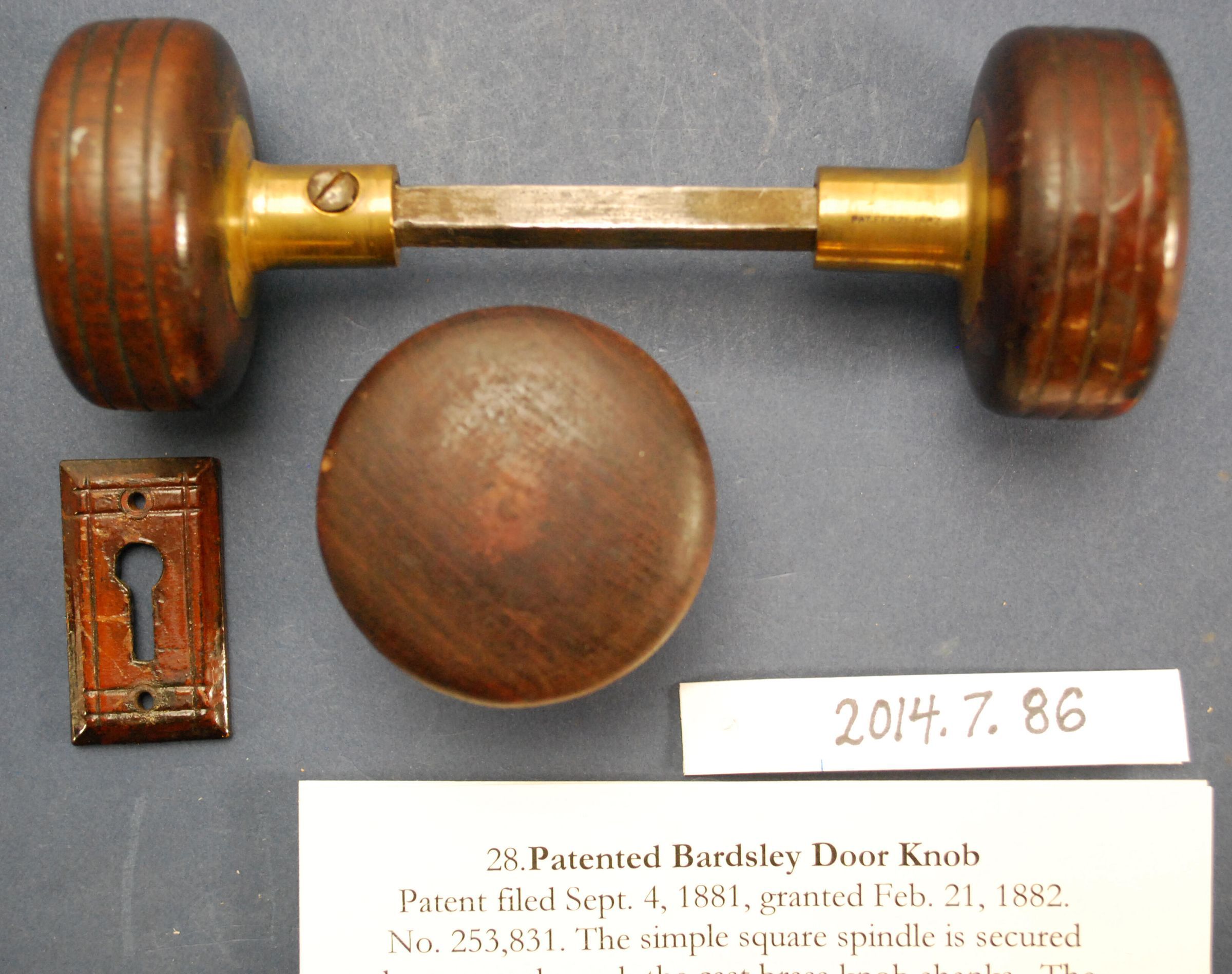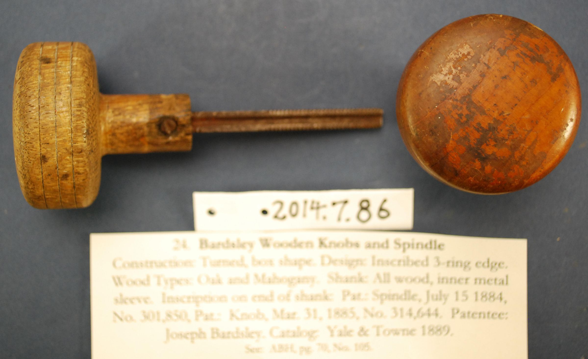 Design Name: Manufacturer: Joseph Bardsley Co. Style: Material: Wood Manufacturing Method: Turned Surface Finish: Varnished VDA Classification: Wood VDA Number: Shape: Drum Patent Specifics: Lock Type (If Applicable): Inscription/Makers Mark: Inscription Text: Comments: Pair of doorknobs on spindle; two different woods, probably oak and fine grain hardwood.
