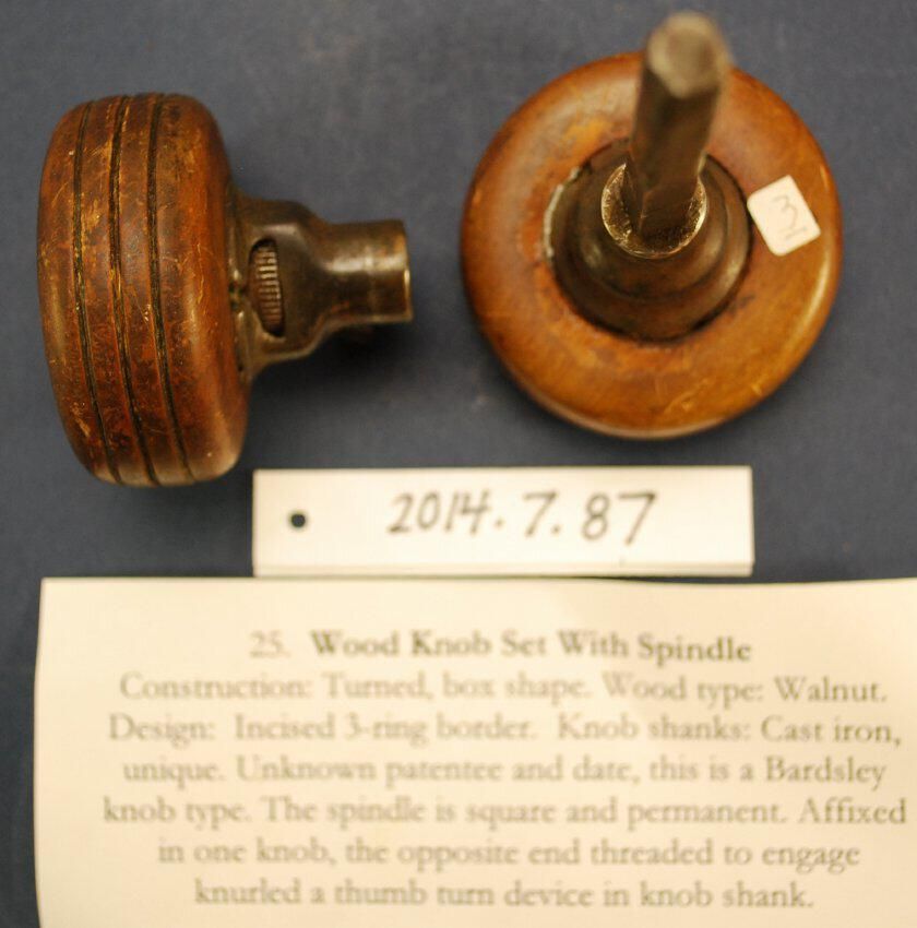 Design Name: Manufacturer: Unknown Style: Material: Wood / Iron Manufacturing Method: Surface Finish: Varnished VDA Classification: Wood VDA Number: Shape: Drum Patent Specifics: Lock Type (If Applicable): Inscription/Makers Mark: Inscription Text: Comments: Matched pair of doorknobs mounted on spindle - one knob has adjuster screw.