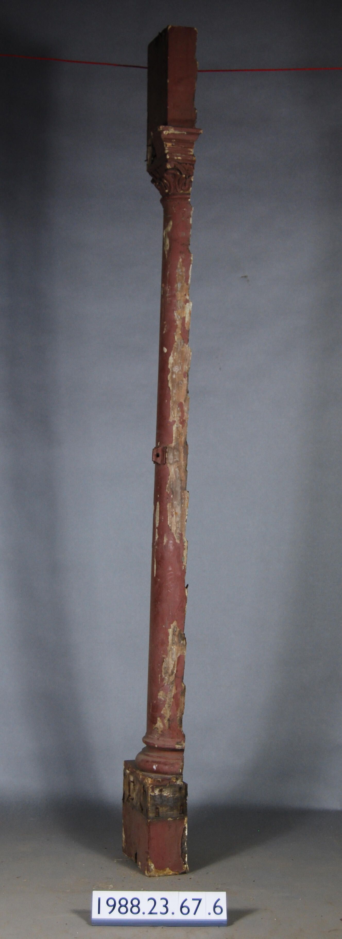 Exterior wood porch column. Classical revival style. Half-round cross-section. Tapered shaft. Carved botanical motif capital. Square top,and bottom. Originally with applied moldings. Moldings missing except one at capital. Painted dark reddish brown. Manufacturer: Place of Manufacturer: Design motif: Botanical Style: Finish: Painted
