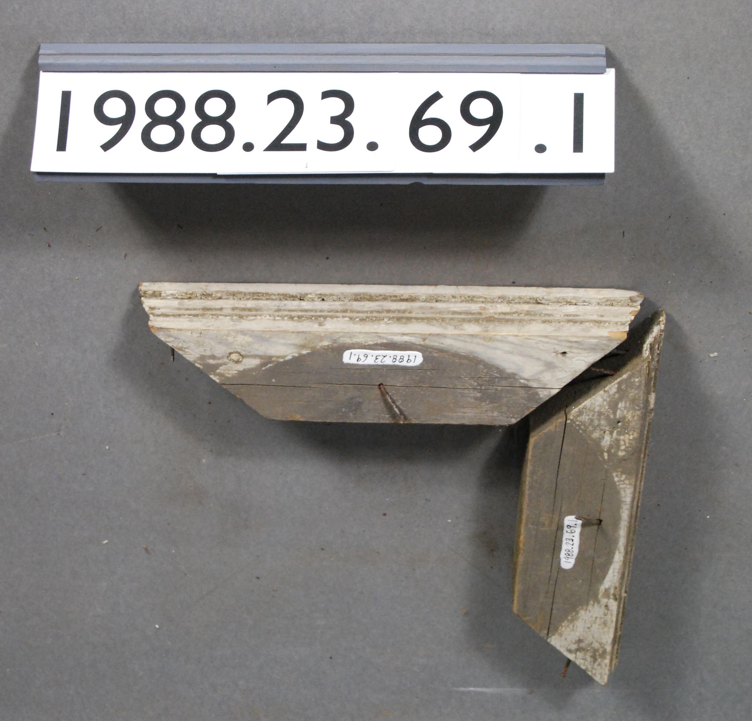 Exterior wood square cap bloc. Probably originally from top of Classical Reival style column. Originally composed of four pieces joined with mitred corners. Two pieces are missing. Parts detached. Edges have compound molded profile. Painted white.