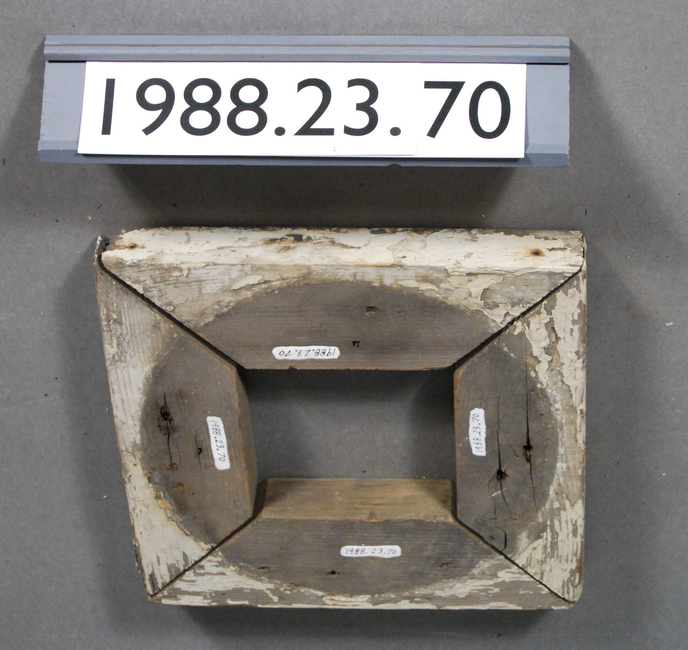 Exterior wood square cap bloc. Probably originally from top of Classical Revival style column. Composed of four pieces originally joined with mitred corners. Parts now detached.