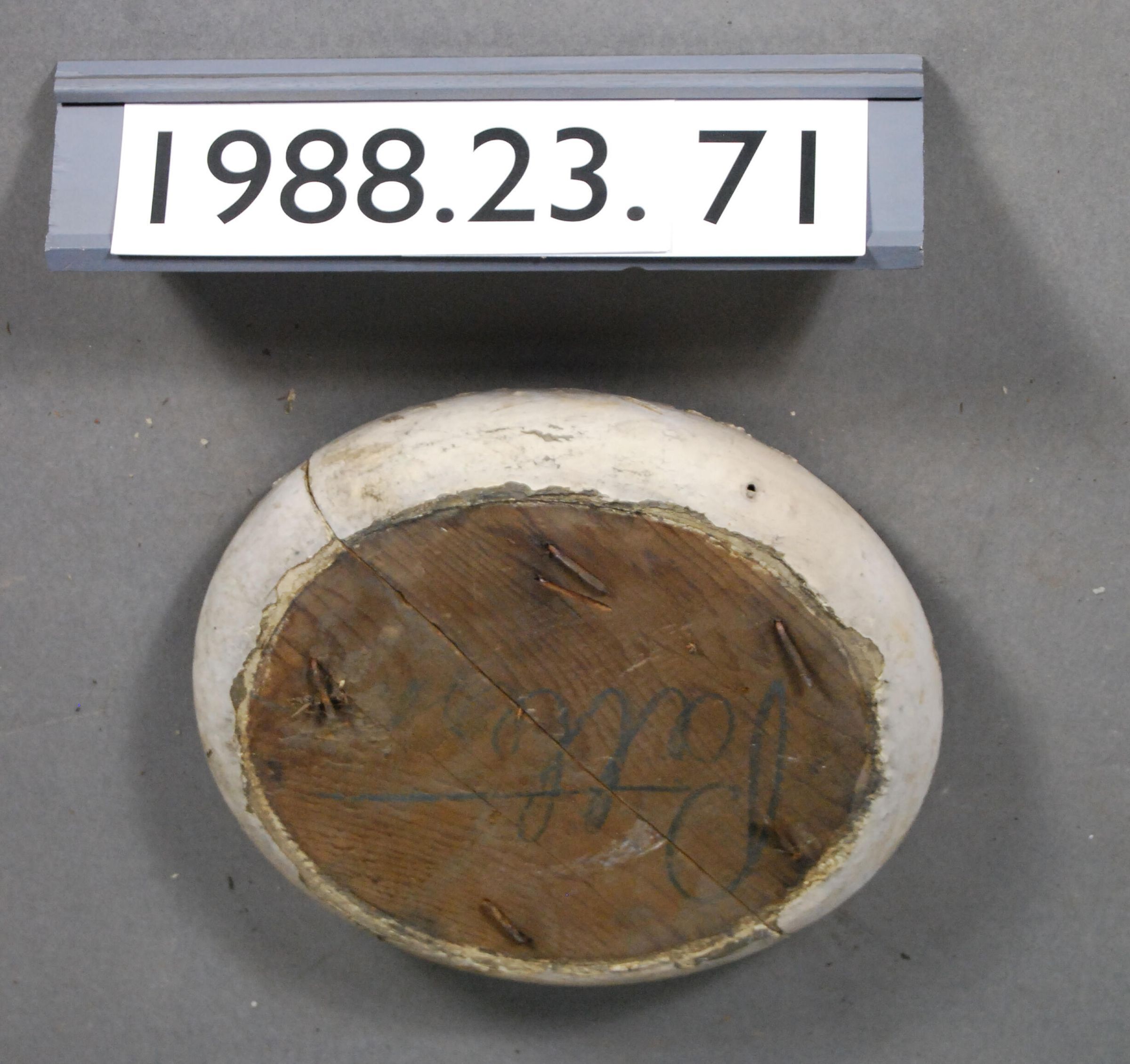 Exterior wood circular cap block (Abacus) originally from top of Classical Revival style column. Cut from single block. Now broken into two pieces. Has inscription: "PATTERN' in blue crayon. Painted beige.