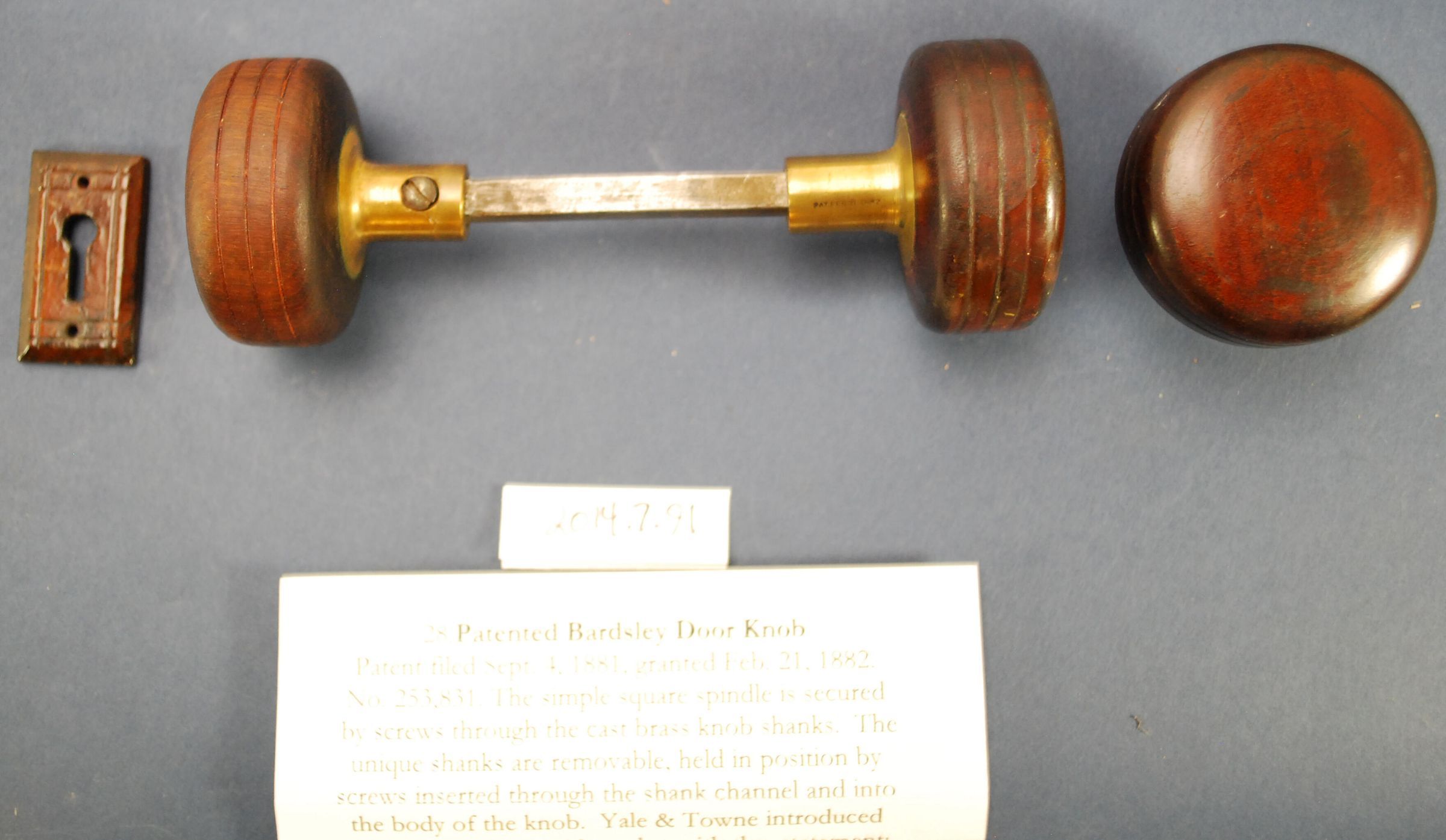 Design Name: Manufacturer: Joseph Bardsley Co. / Yale & Towne (?) Style: Material: Wood / Bronze Manufacturing Method: Turned / Cast Surface Finish: VDA Classification: Wood VDA Number: Shape: Drum Patent Specifics: Joseph Bardsley patent Lock Type (If Applicable): Inscription/Makers Mark: Inscription Text: Pat. Feb 21, 1882 Comments: Matching set of three doorknobs (two on spindle), one wood key escutcheon.