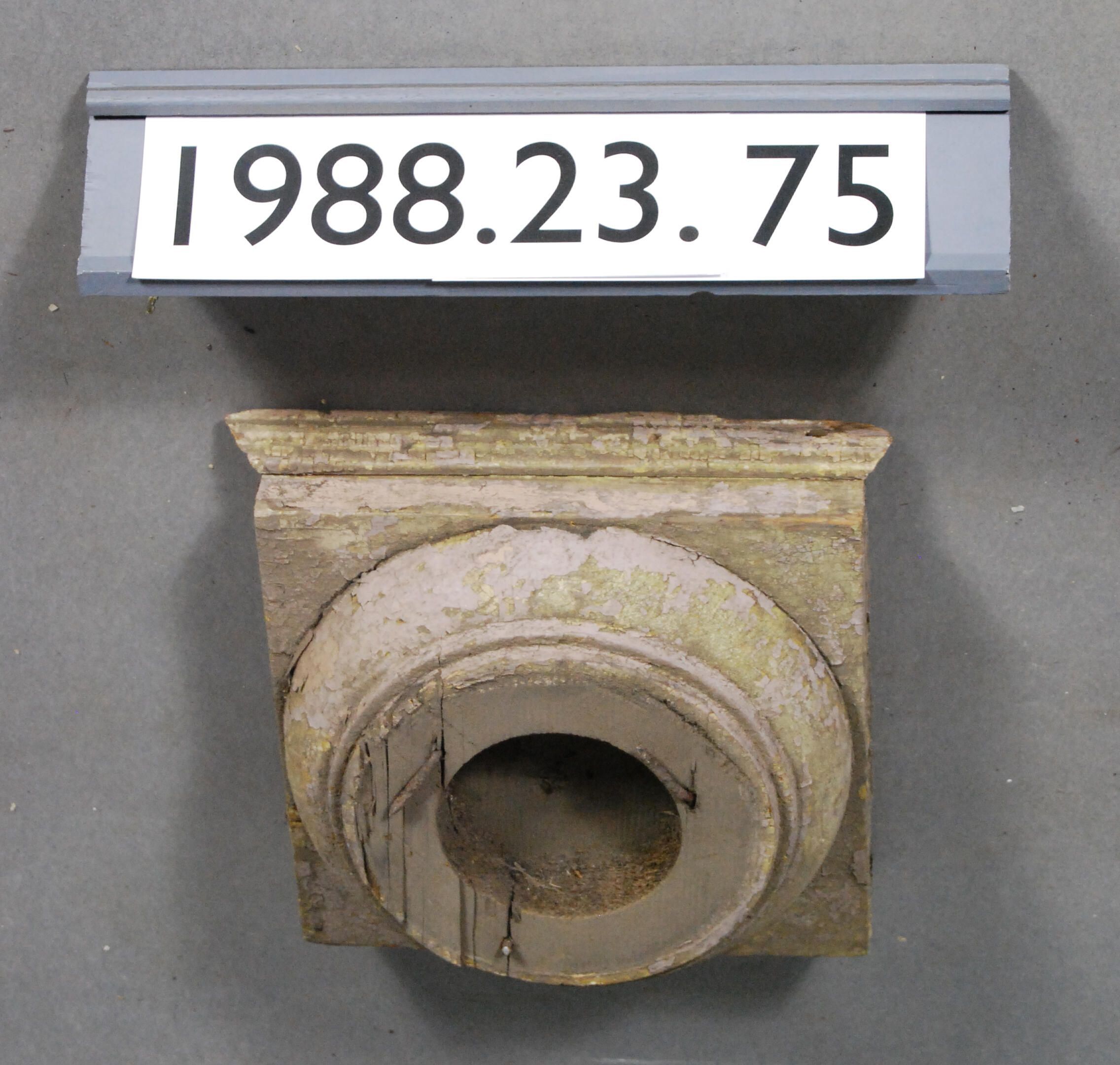 Exterior wood cap block. Originally from top of Classical Revival style column. Composed of single square abacus block and circular capital. Square block has single remaining molding. Painted pink / purple.