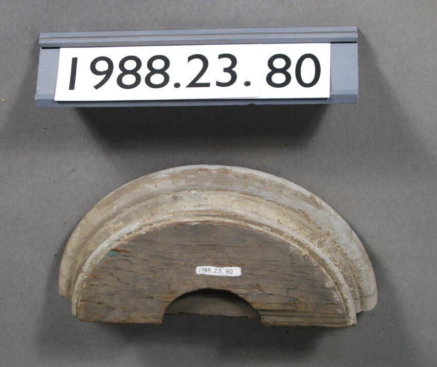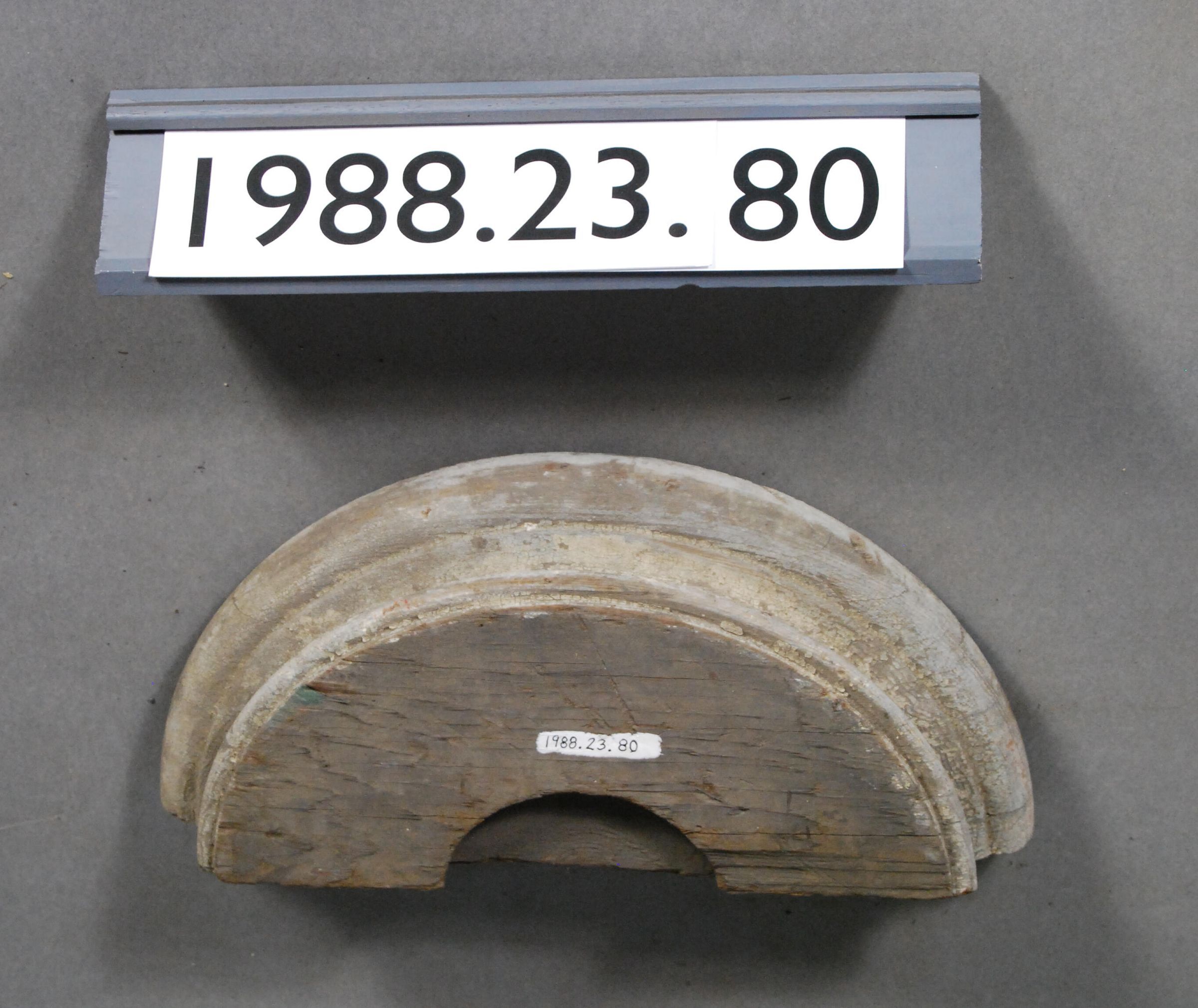 Exterior wood semi-circular component from Classical revival style column. Originally circular. Approximately half is missing. Has molded edge. Could serve as capital or base. Painted grey / white.