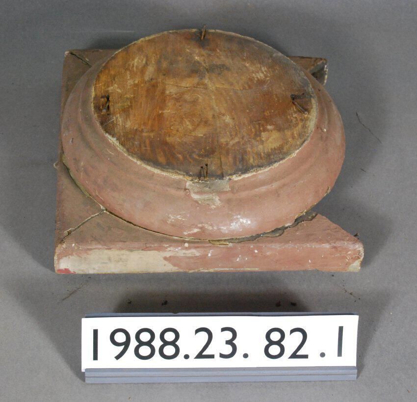 Exterior wood base block component from Classical Revival style column. Composed of square base with mitred corners, (one side is missing), above which is circular component with molded edge. Painted brown.