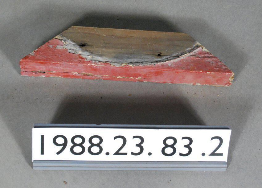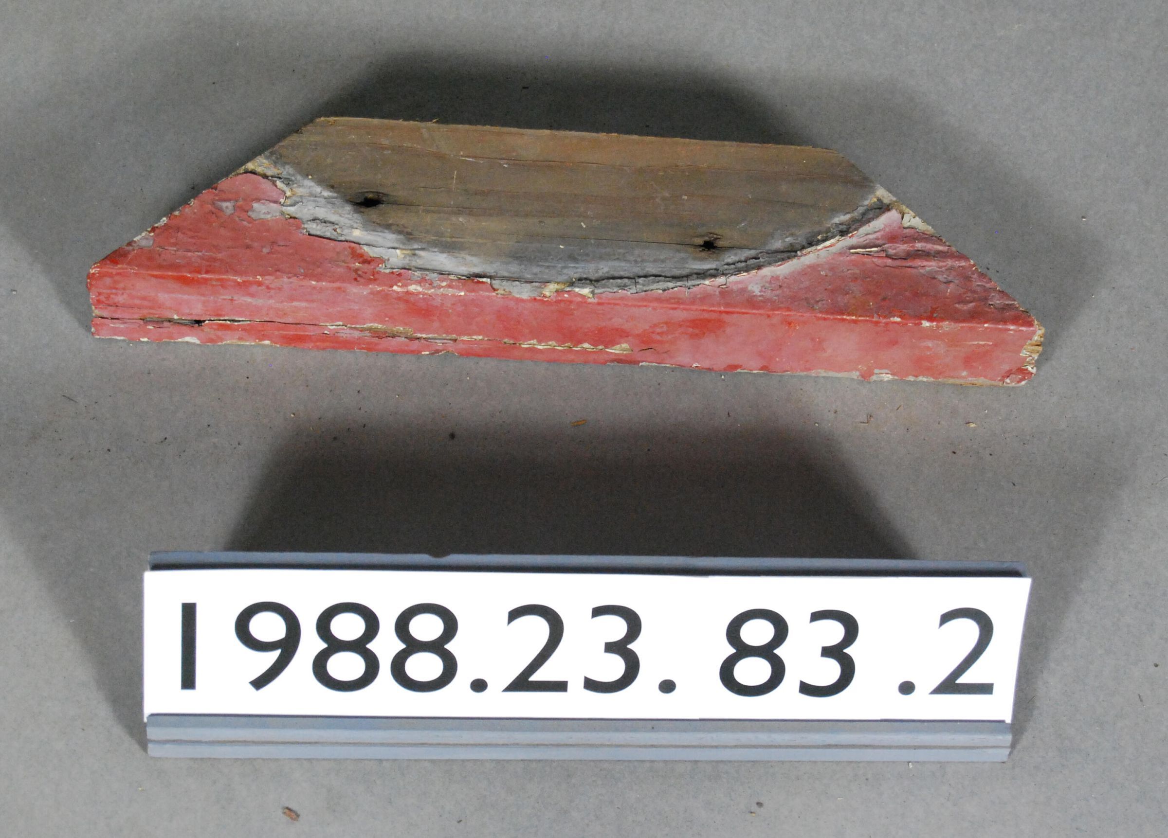 Exterior wood component from column. Has two mitred corners. Originally joined at corners with three other sides which are now missing. Could serve as top or base of column. Painted dark reddish brown.