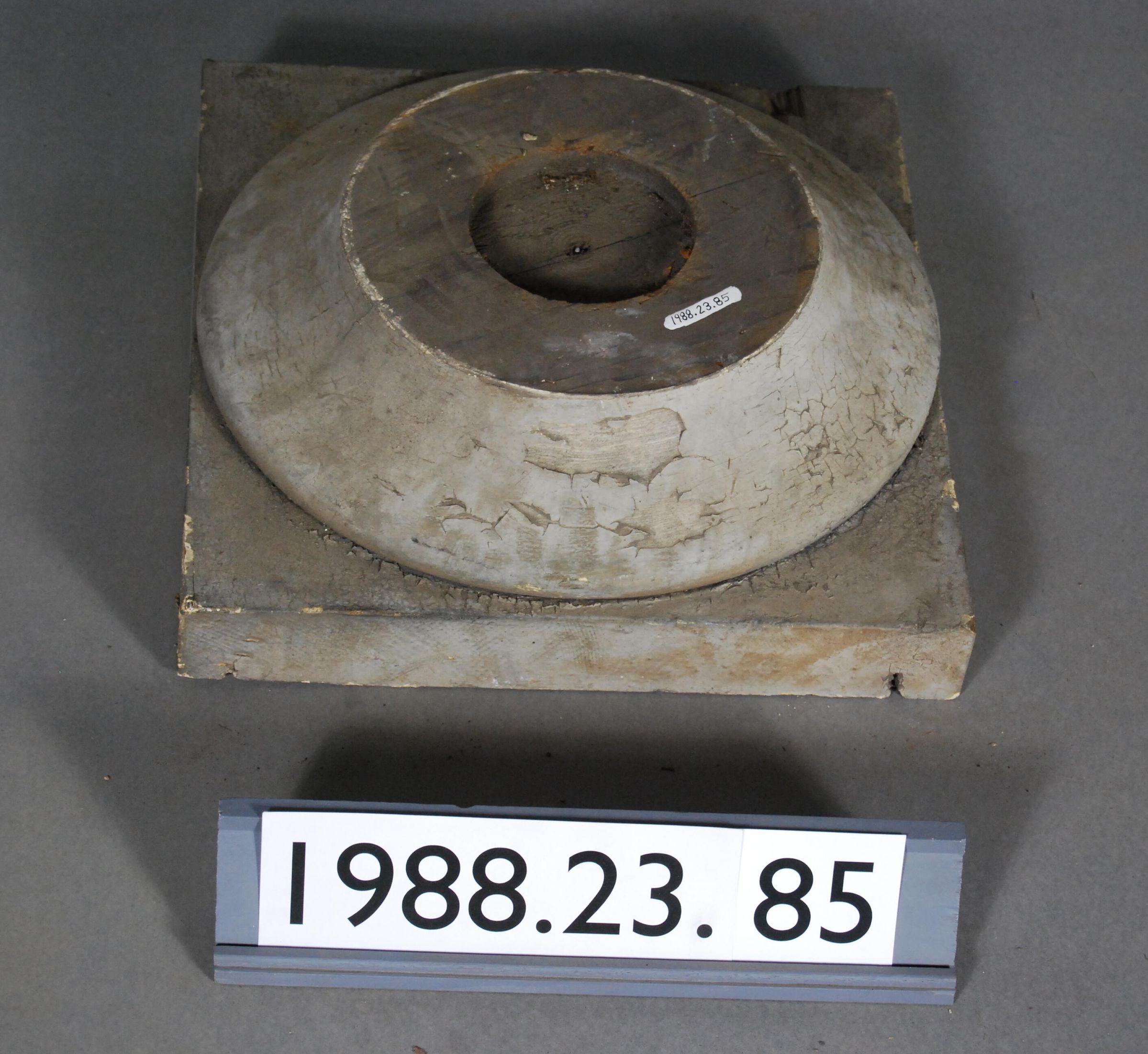 Exterior wood Classical Revival Style base from column. Square block above which is circular block with cove. Molded edge.