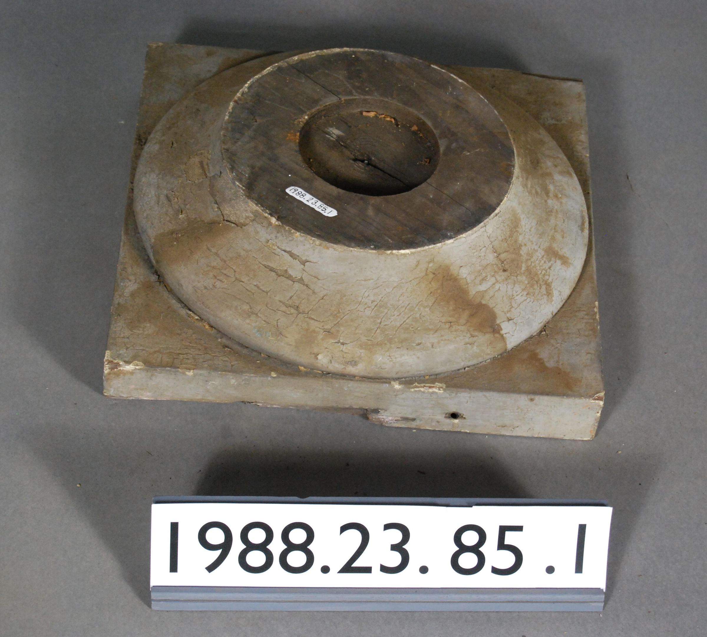 Exterior wood base from column. Square block above which is circular component with cove molded edge. Manufacturer: Place of Manufacturer: Design motif: Style: Finish: Painted