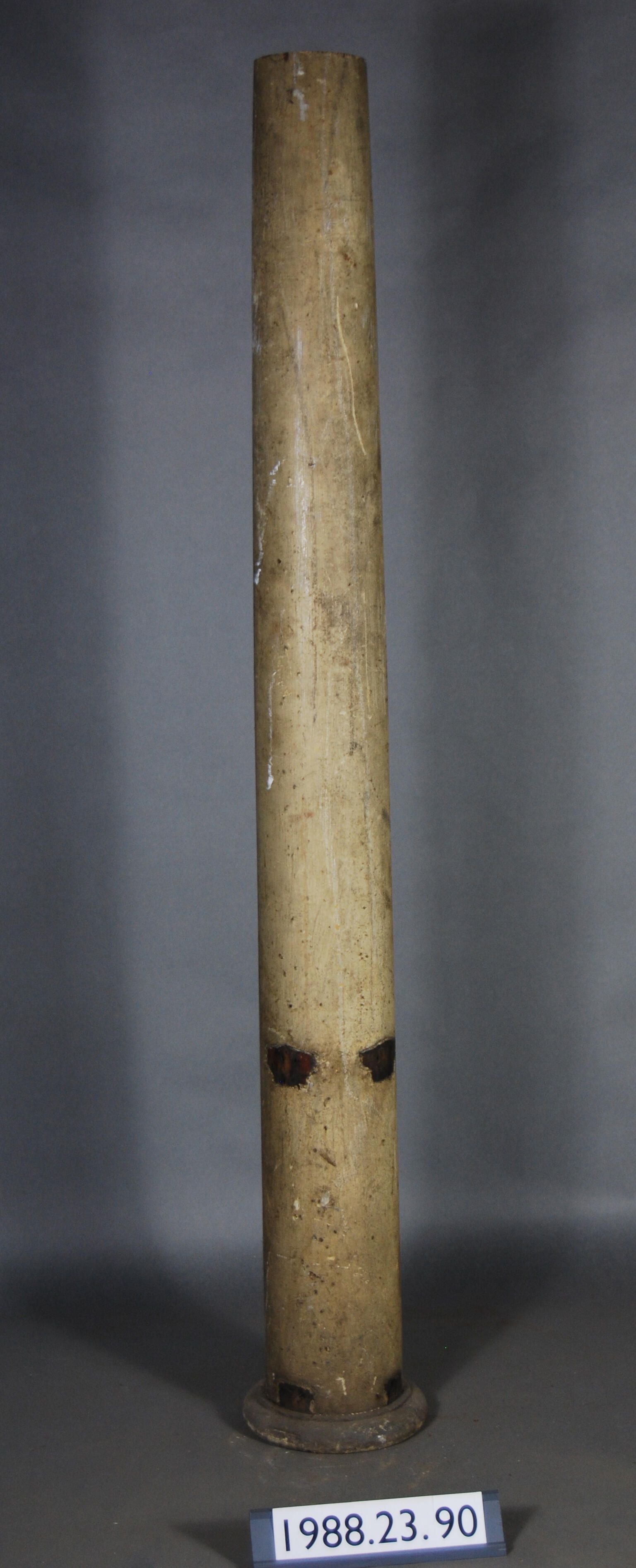 Exterior wood Tuscan style column. Turned from single piece of timber. Tapered shaft. Solid center. Attached circular base. Painted white (now appears grey). Manufacturer: Place of Manufacturer: Design motif: Style: Finish: Painted