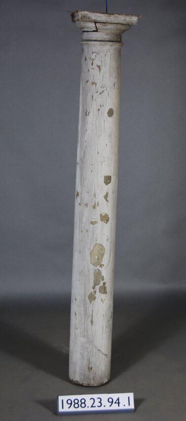 Exterior wood Tuscan style column. Turned from single piece of timber. Upper end has turned molded ornament. Capped with Doric (broken) abacus. Below is tapered shaft. Painted grey.