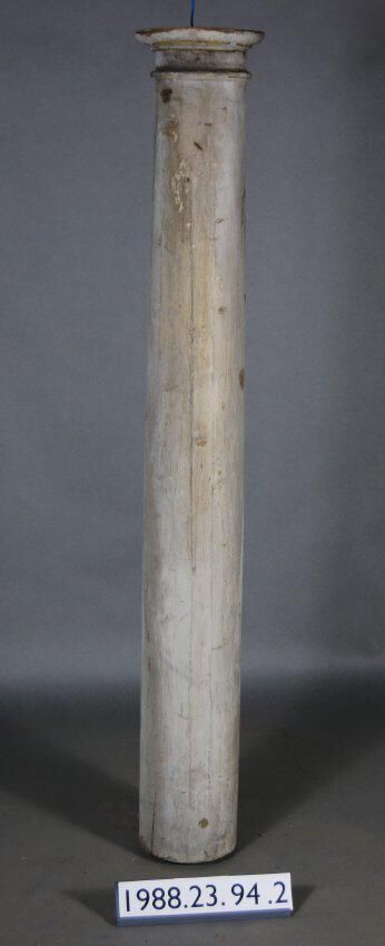Exterior wood Tuscan style column. Turned from single piece of timber. Upper end has turned molded ornament. Has incomplete broken abacus piece at top. Manufacturer: Place of Manufacturer: Design motif: Style: Finish: Painted