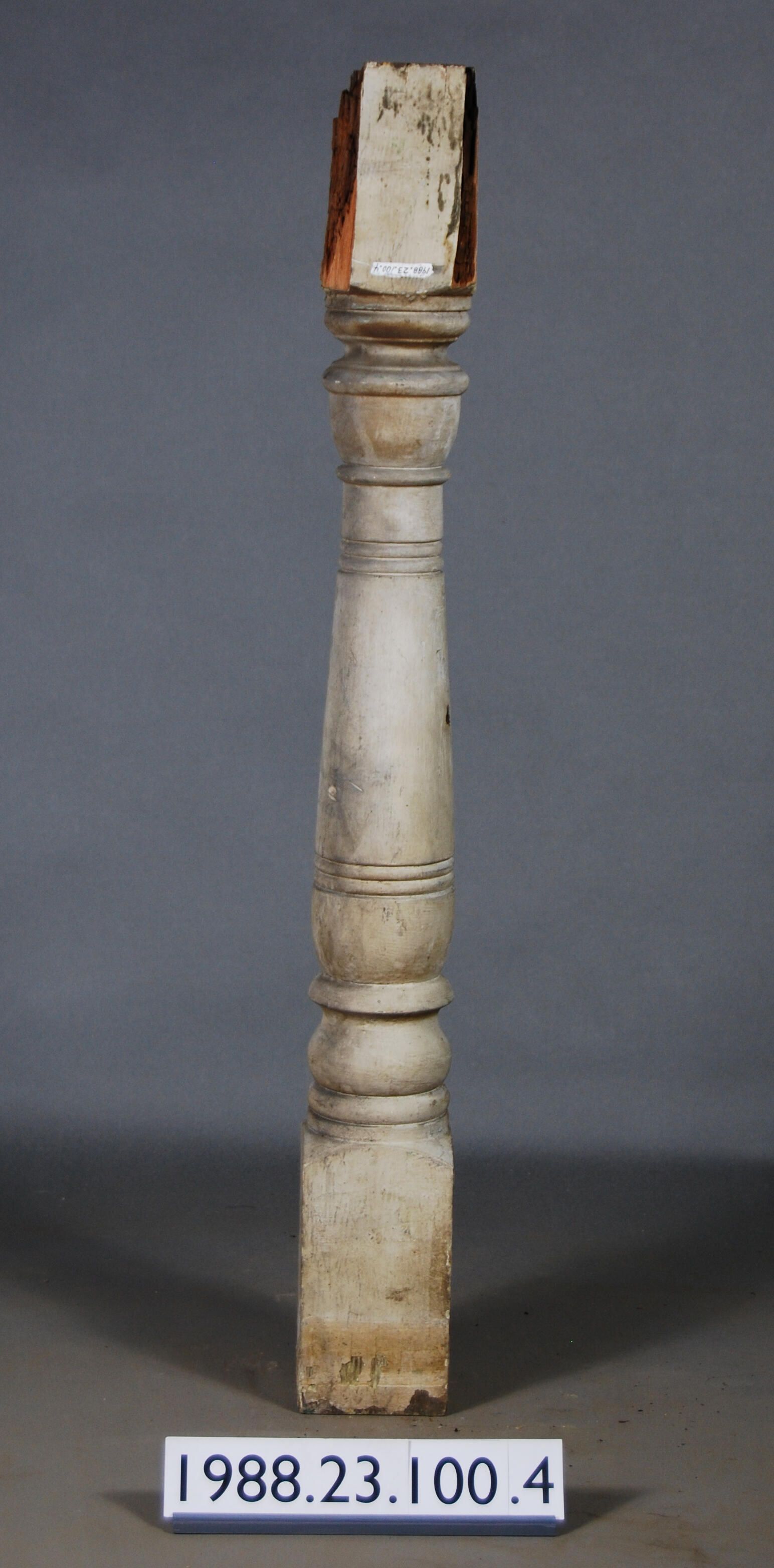 Exterior wood baluster shaped post turned from single piece of timber. Has banded ornamentation. Severe dry rot at top. Portions missing. Painted off-white. Manufacturer: Place of Manufacturer: Design motif: Style: Finish: Painted