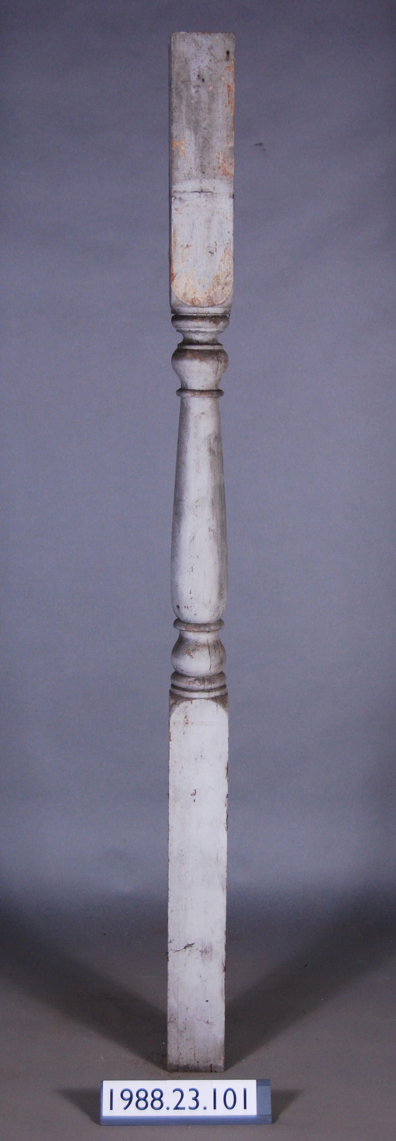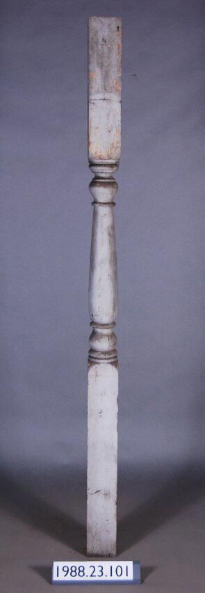 Exterior wood baluster shaped post turned from single piece of timber. Has banded ornamentation. Painted grey. Manufacturer: Place of Manufacturer: Design motif: Style: Finish: Painted