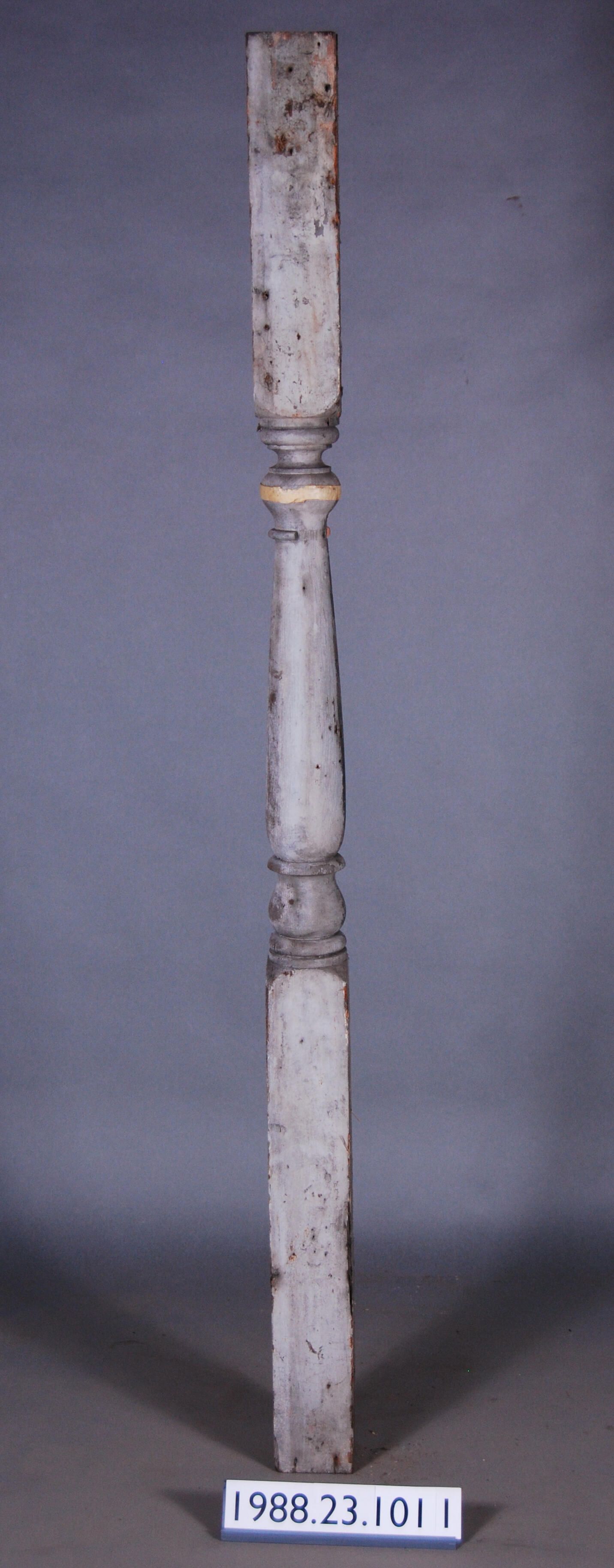 Exterior wood baluster shaped post turned from single piece of timber. Has banded ornamentation. Painted grey. Part of ornamentation broken off on top section. Manufacturer: Place of Manufacturer: Design motif: Style: Finish: Painted