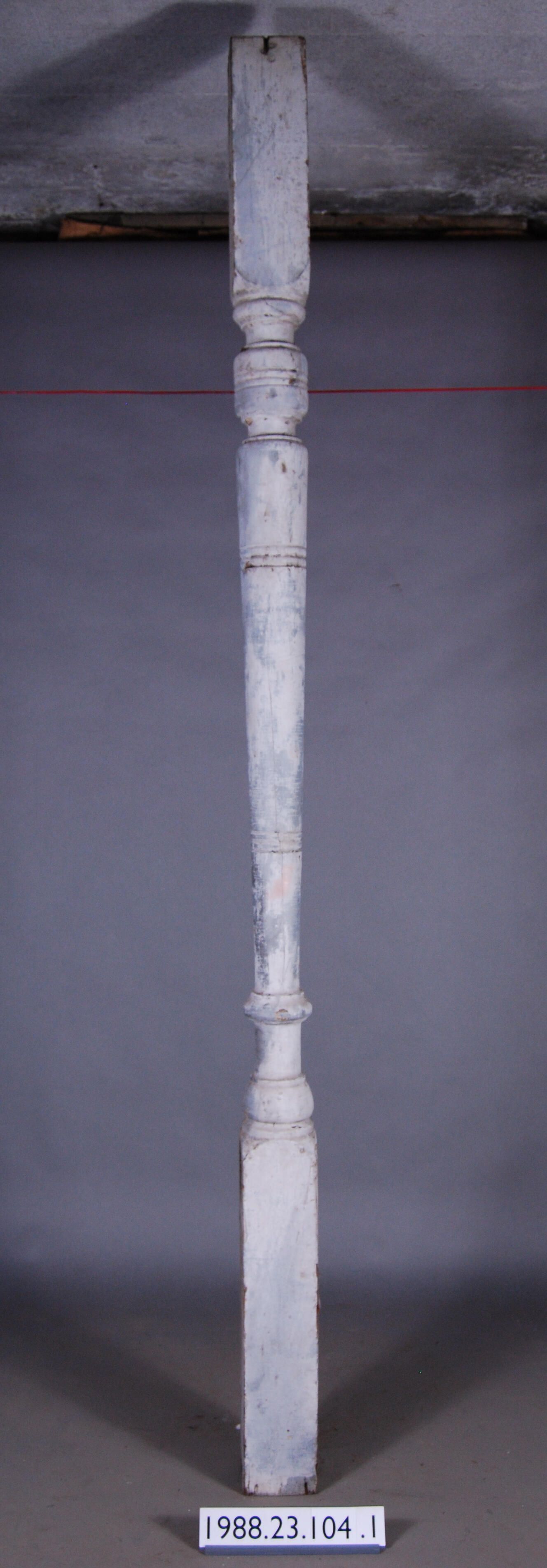 Exterior wood baluster shaped post turned from single piece of timber. Has banded ornamentation. Painted off-white. Manufacturer: Place of Manufacturer: Design motif: Style: Finish: Painted