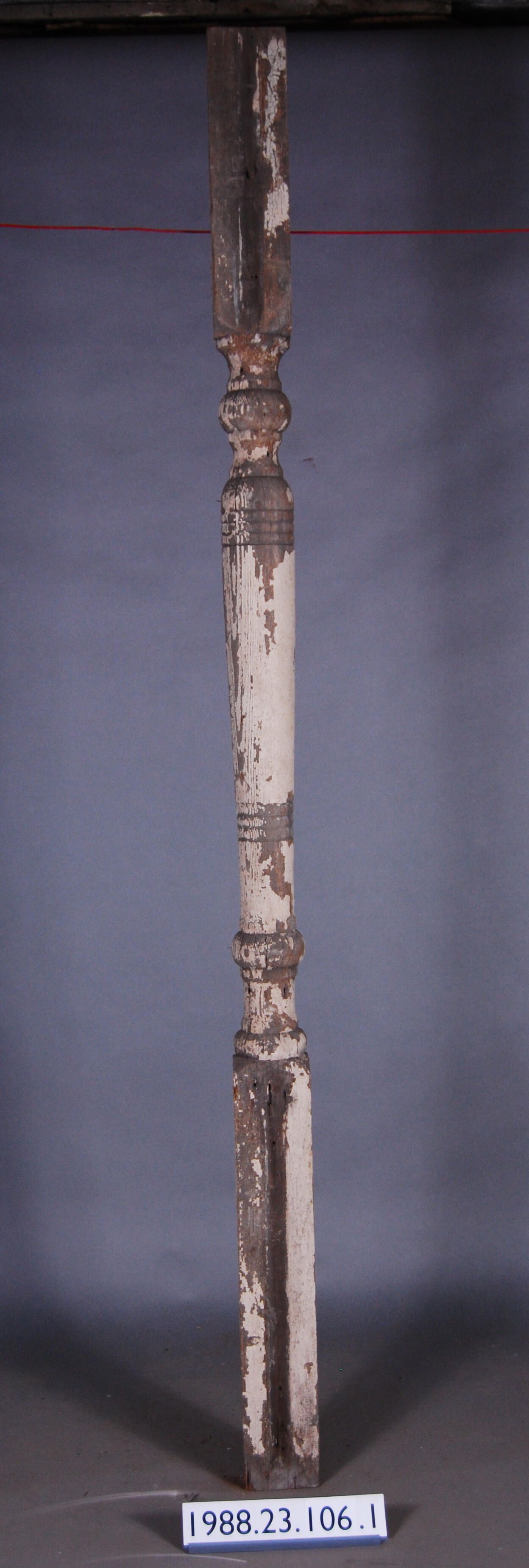 Exterior wood half of a baluster shaped post. Turned from a single piece of timber. Has banded ornamentation. Painted beige. Manufacturer: Place of Manufacturer: Design motif: Style: Finish: Painted