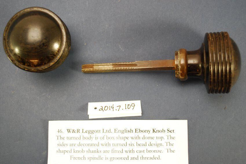 Design Name: Manufacturer: W. & R. Leggott Ltd. Style: Material: Wood Manufacturing Method: Turned Surface Finish: VDA Classification: VDA Number: Shape: Drum / Domed Patent Specifics: Lock Type (If Applicable): Inscription/Makers Mark: Inscription Text: Comments: Brass shank; two knobs with spindle. Possibly ebony.