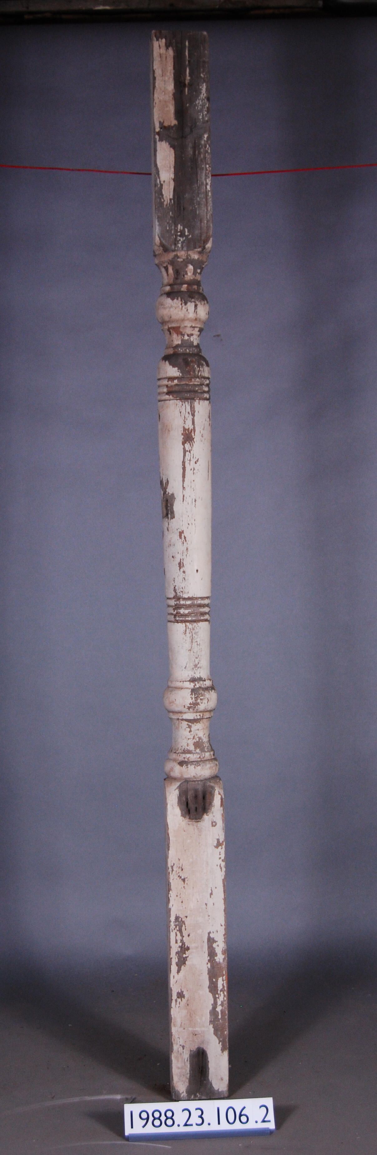 Exterior wood half of a baluster shaped post. Turned from a single piece of timber. Has banded ornamentation. Painted beige. Manufacturer: Place of Manufacturer: Design motif: Style: Finish: Painted