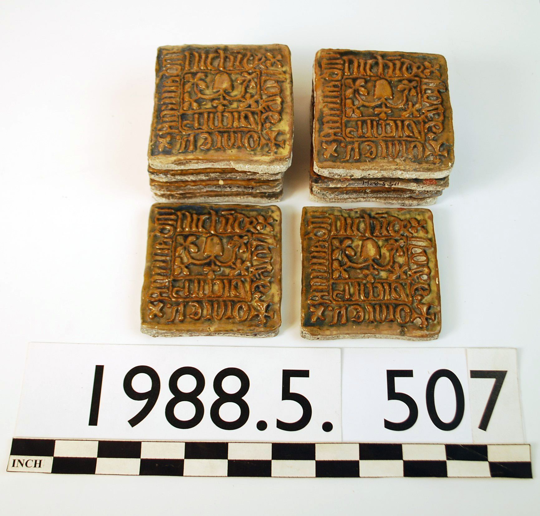 10, square, glazed ceramic, relief, high gloss, floral and lettering pattern
