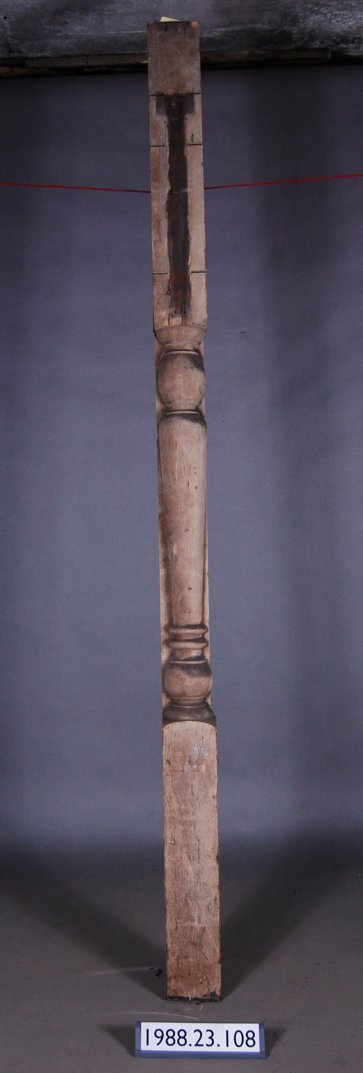 Exterior wood half cross section of baluster shaped post. Turned from a single piece of timber. Mounted on flat board. Painted grey. Manufacturer: Place of Manufacturer: Design motif: Style: Finish: Painted