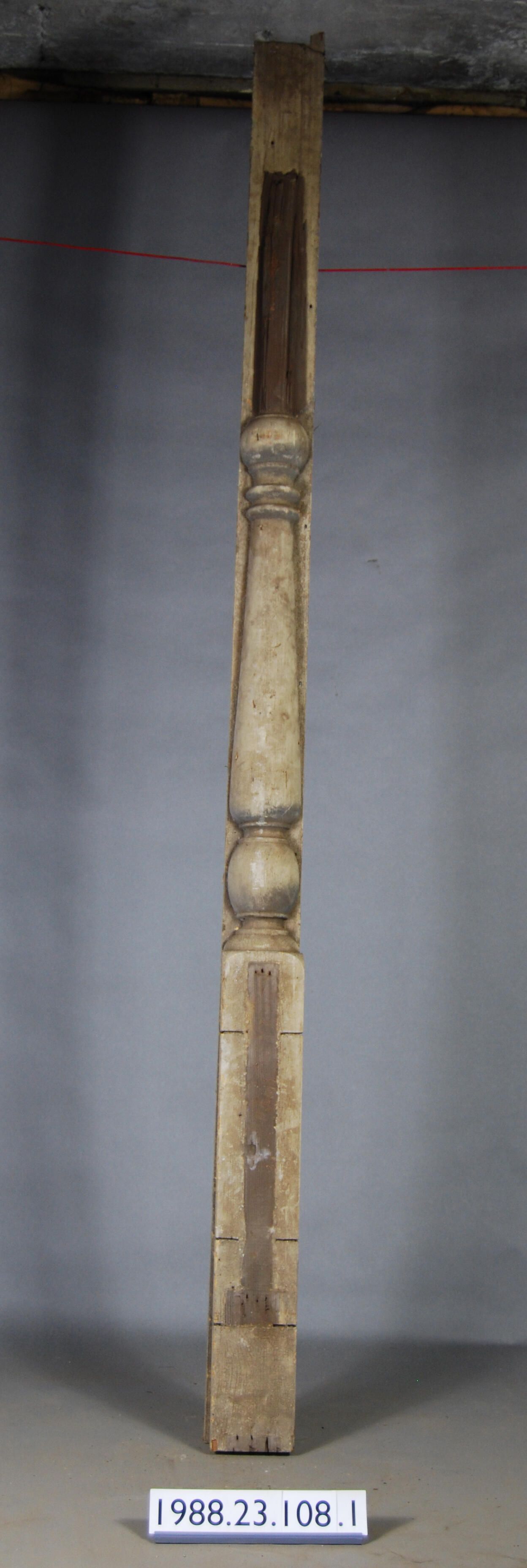 Exterior wood half cross section of baluster shaped post. Turned from a single piece of timber. Mounted on flat board. Board backing is intact. Full length. One end of post is missing. Painted grey.