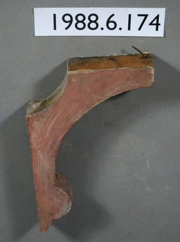 Wood bracket. Compound contour. Cut from single block. Partially fluted front. Painted dark reddish brown Inscriptions or Markings: Manufacturer: Place of Manufacturer: Design motif: Style: Finish: Painted