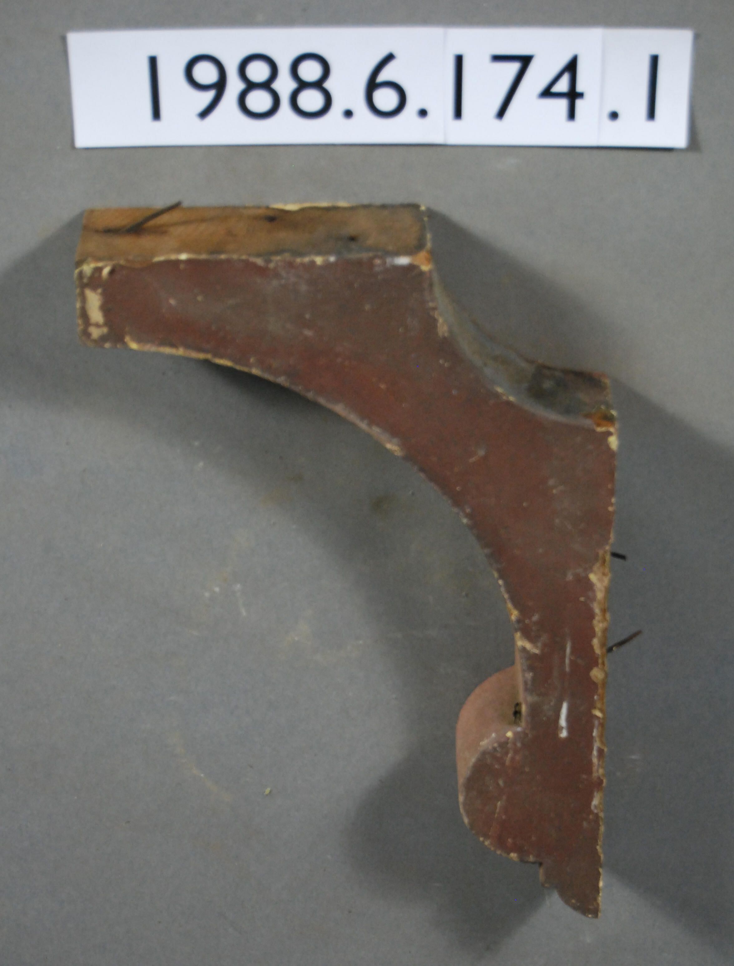 Wood bracket. Compound contour. Cut from single block. Partially fluted front. Painted dark reddish brown Inscriptions or Markings: Manufacturer: Place of Manufacturer: Design motif: Style: Finish: Painted