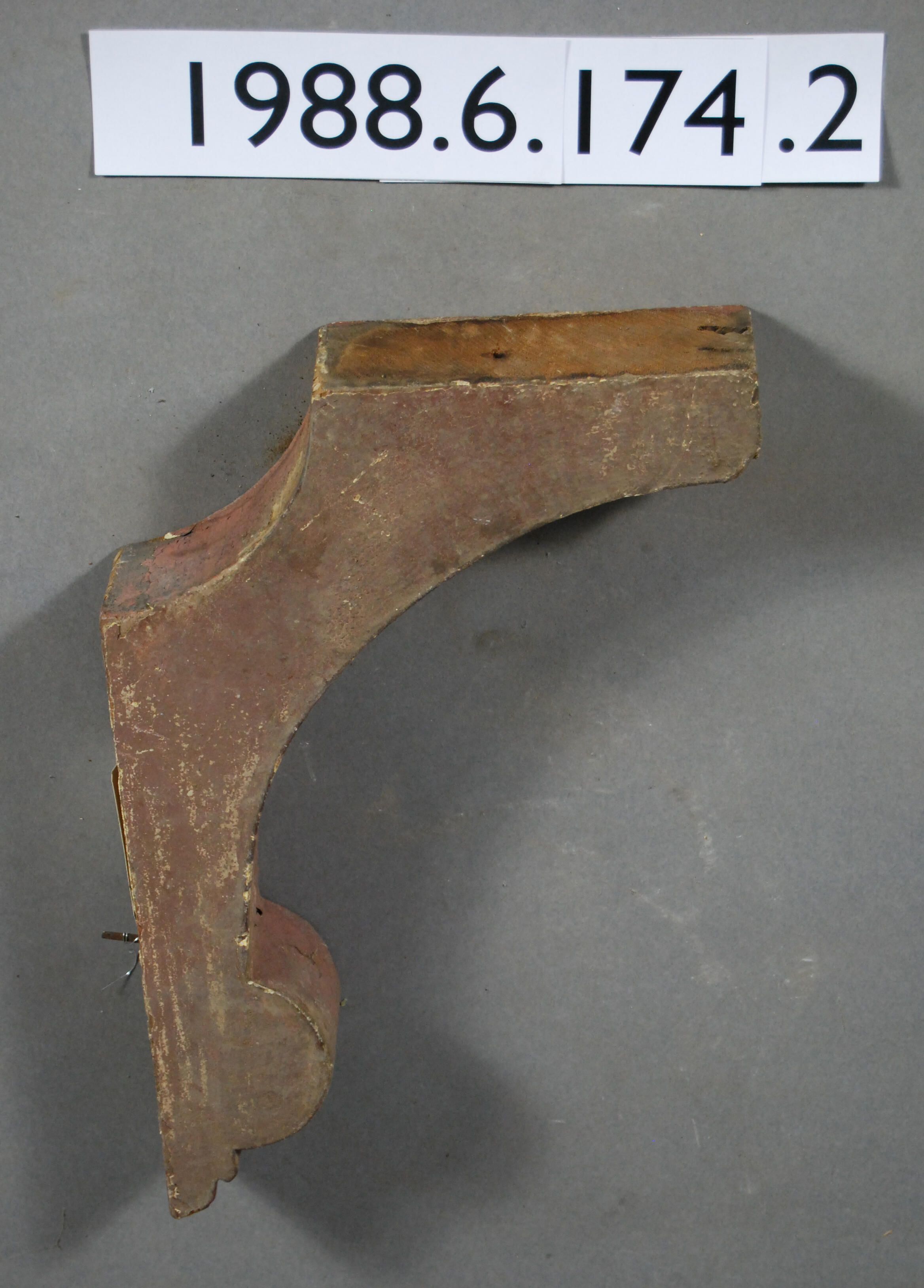 Wood bracket. Compound contour. Cut from single block. Partially fluted front. Painted dark reddish brown Inscriptions or Markings: Manufacturer: Place of Manufacturer: Design motif: Style: Finish: Painted