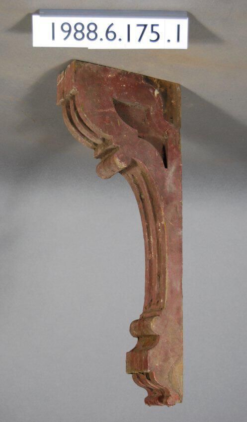 Wood bracket. Compound contour. Recessed panel on each respective side. Partially fluted front. Painted dark reddish brown Inscriptions or Markings: Manufacturer: Place of Manufacturer: Design motif: Style: Finish: Painted