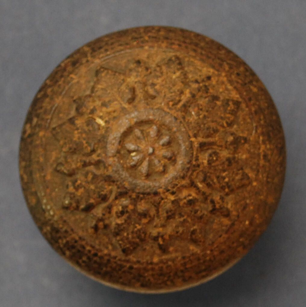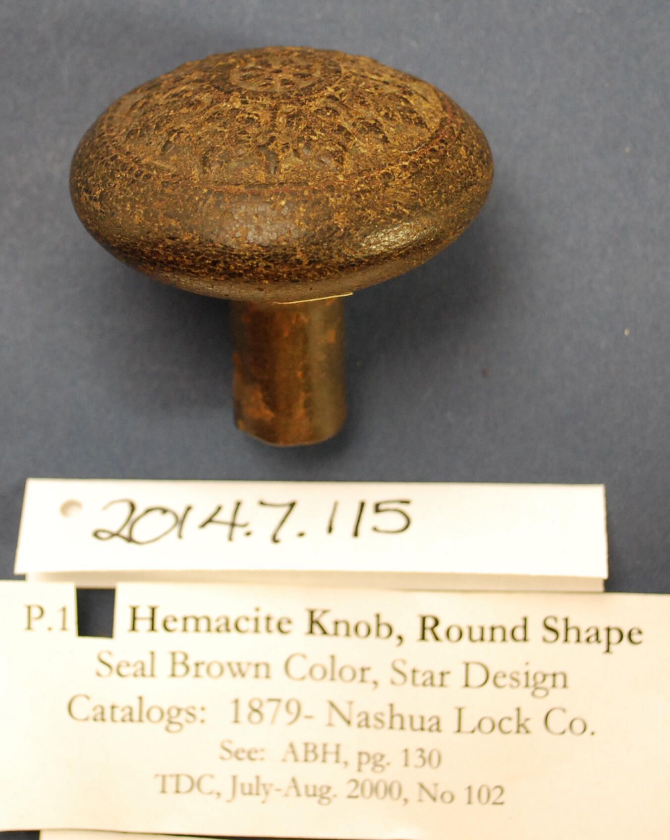 Design Name: Star Manufacturer: Dibble Mfg. Co. Style: Material: Hemacite / Iron Manufacturing Method: Pressed / Cast Surface Finish: VDA Classification: Composition VDA Number: Shape: Domed Patent Specifics: 1877 - 1878 Lock Type (If Applicable): Inscription/Makers Mark: Inscription Text: Comments: Cracked - see 2014.7.116