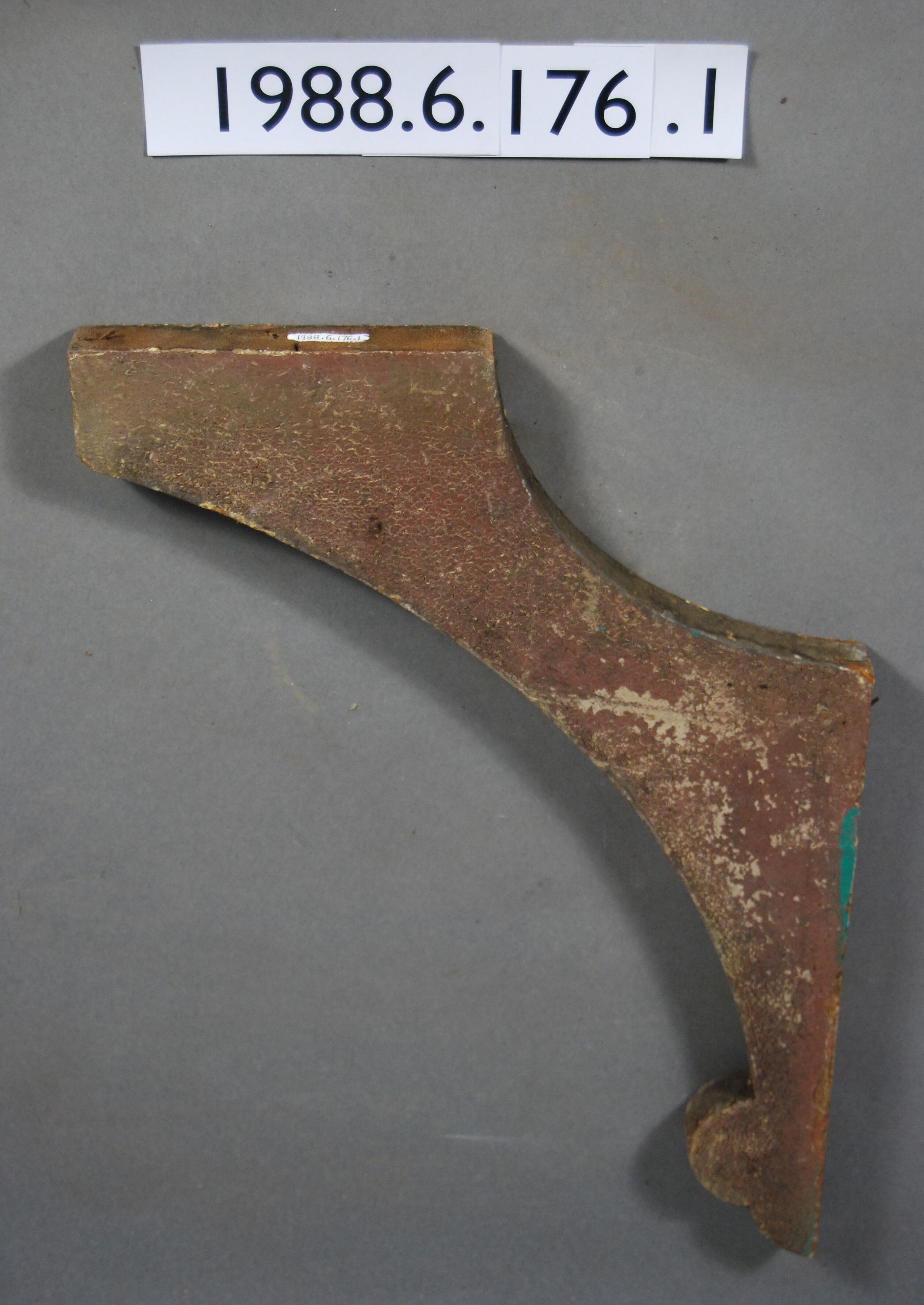 Wood bracket. Compound contour. Curved front. Cut from single block. Painted dark reddish brown Inscriptions or Markings: Manufacturer: Place of Manufacturer: Design motif: Style: Finish: Painted