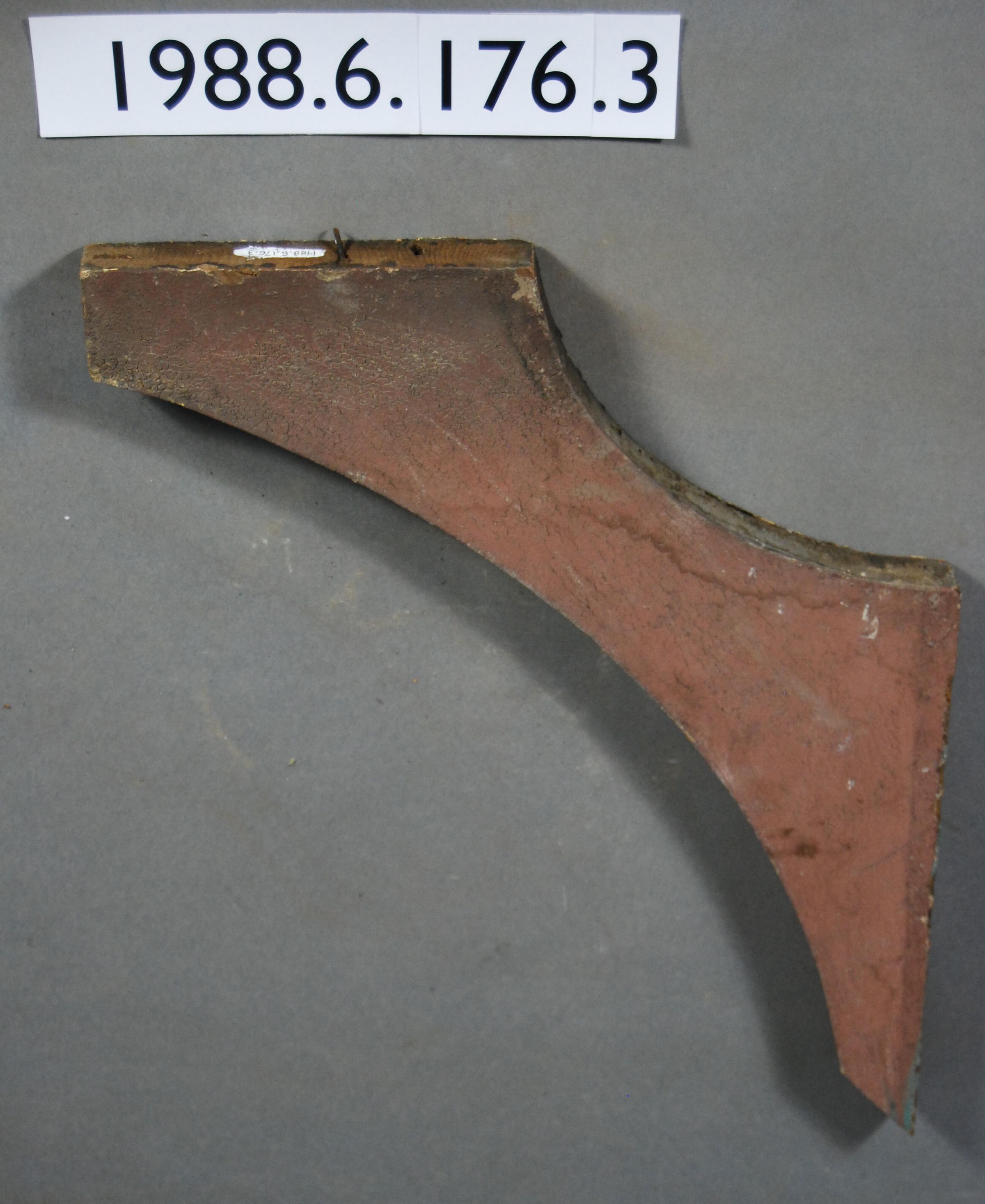 Wood bracket. Compound contour. Curved front. Cut from single block. Lower end is truncated. Painted dark reddish brown Inscriptions or Markings: Manufacturer: Place of Manufacturer: Design motif: Style: Finish: Painted