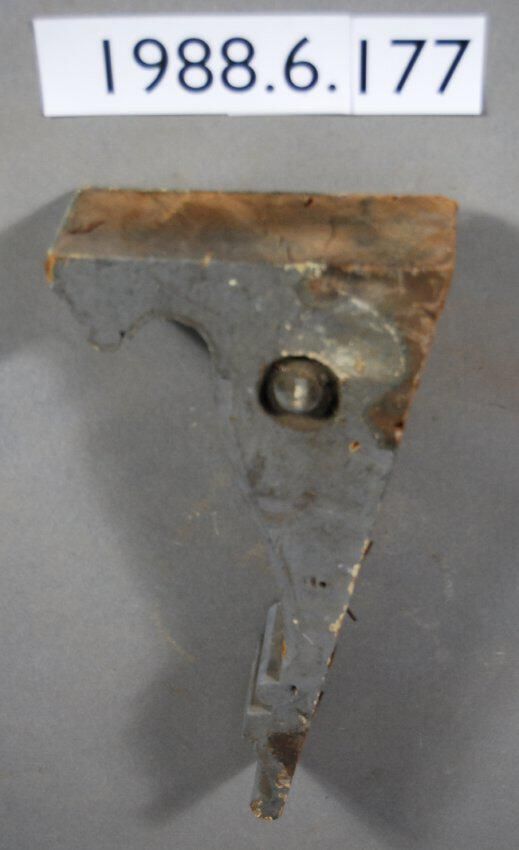 Wood cornice bracket. Angular top. Button ornament on each respective side. Compound contour. Partially fluted front. Painted grey Inscriptions or Markings: Manufacturer: Place of Manufacturer: Design motif: Style: Finish: Painted