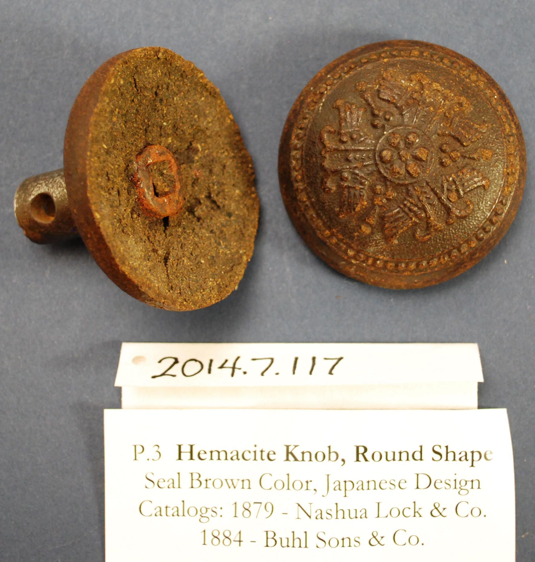 Design Name: Manufacturer: Dibble Mfg. Co. Style: Japanesque Material: Hemacite / Iron Manufacturing Method: Pressed / Cast Surface Finish: VDA Classification: Composition VDA Number: Shape: Domed Patent Specifics: 1877 Lock Type (If Applicable): Inscription/Makers Mark: Inscription Text: Comments: Face of doorknob is broken and detached.