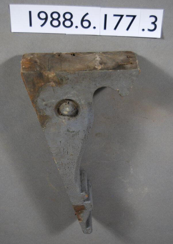 Wood cornice bracket. Angular top. Button ornament on each respective side. Compound contour. Partially fluted front. Painted grey Inscriptions or Markings: Manufacturer: Place of Manufacturer: Design motif: Style: Finish: Painted