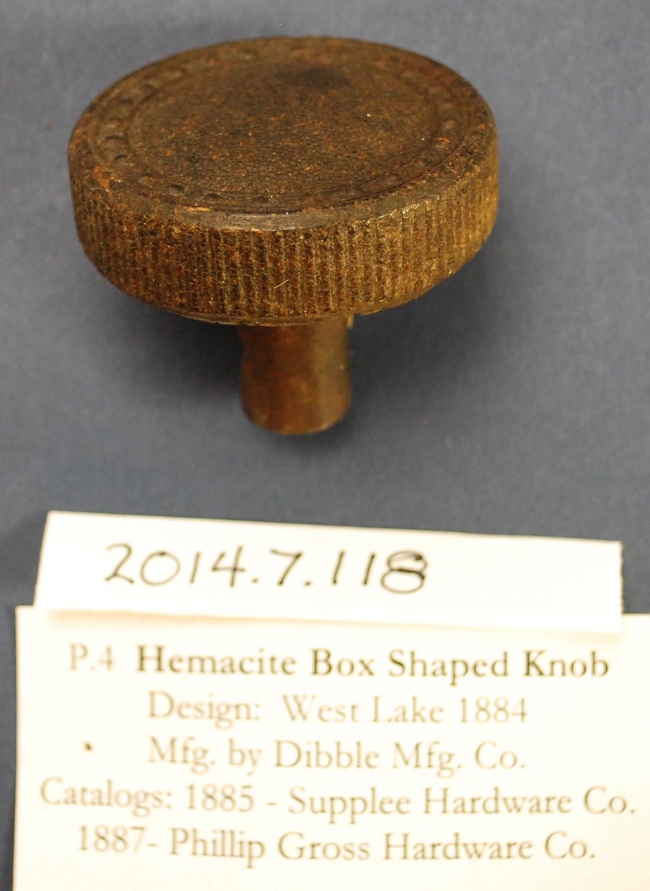 Design Name: Westlake Manufacturer: Dibble Mfg. Co. Style: Material: Hemacite / Iron Manufacturing Method: Pressed / Cast Surface Finish: VDA Classification: Composition VDA Number: Shape: Drum Patent Specifics: 1877 - 1878 Lock Type (If Applicable): Inscription/Makers Mark: Inscription Text: Comments: