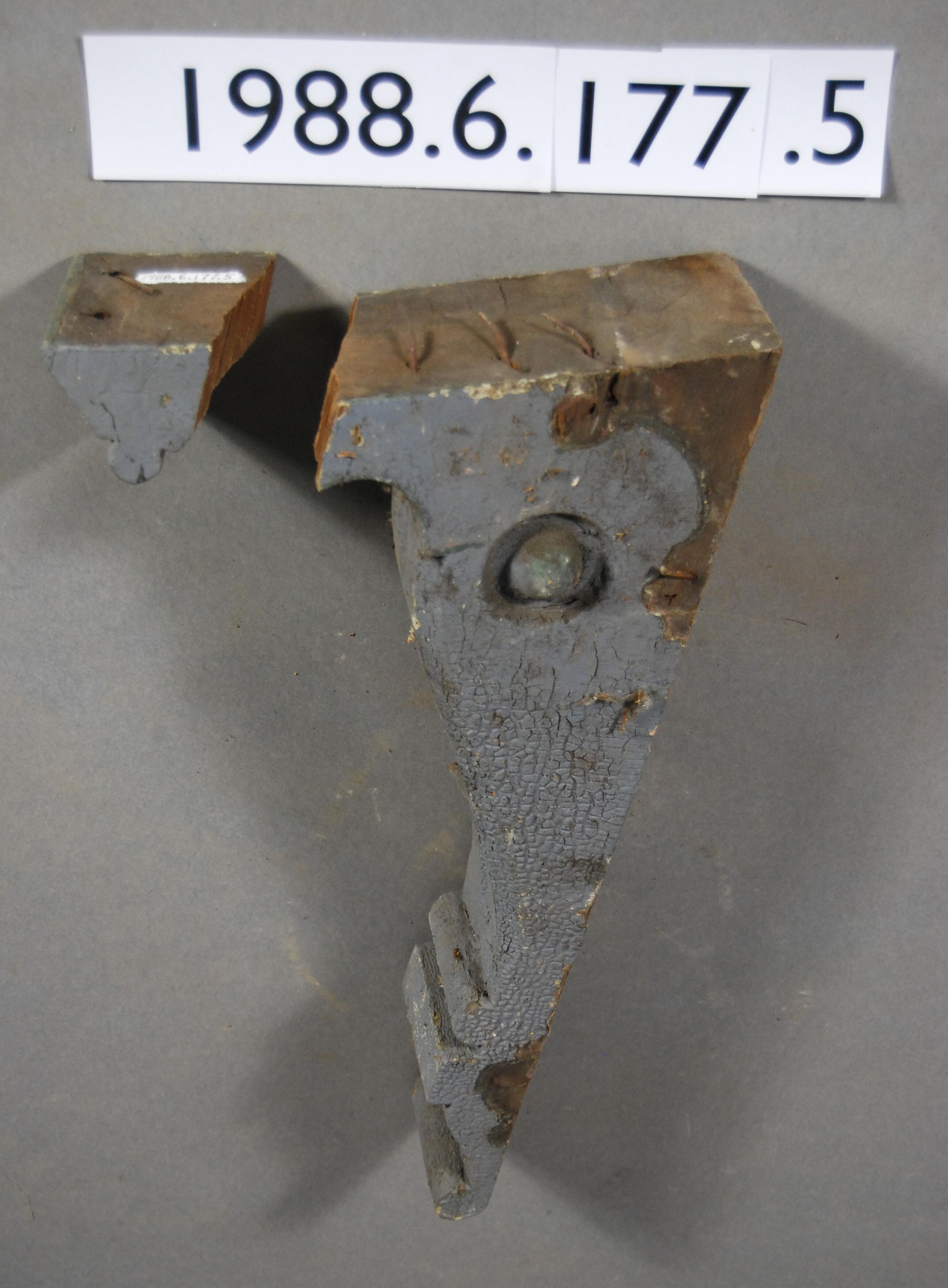 Wood cornice bracket. Angular top. Button ornament on each respective side. Compound contour. Partially fluted front. Painted grey Broken but complete. Inscriptions or Markings: Manufacturer: Place of Manufacturer: Design motif: Style: Finish: Painted