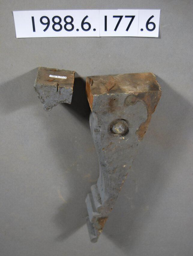 Wood cornice bracket. Angular top. Button ornament on each respective side. Compound contour. Partially fluted front. Painted grey Broken but complete. Inscriptions or Markings: Manufacturer: Place of Manufacturer: Design motif: Style: Finish: Painted