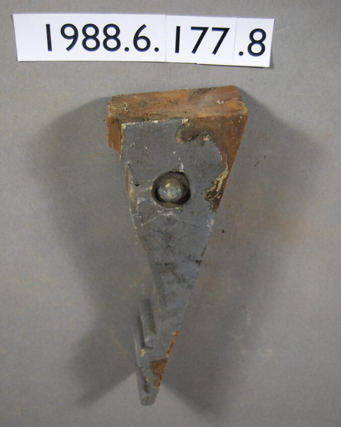 Wood cornice bracket. Angular top. Broken. Incomplete button ornament on each respective side. Compound contour. Partially fluted front. Painted grey Inscriptions or Markings: Manufacturer: Place of Manufacturer: Design motif: Style: Finish: Painted