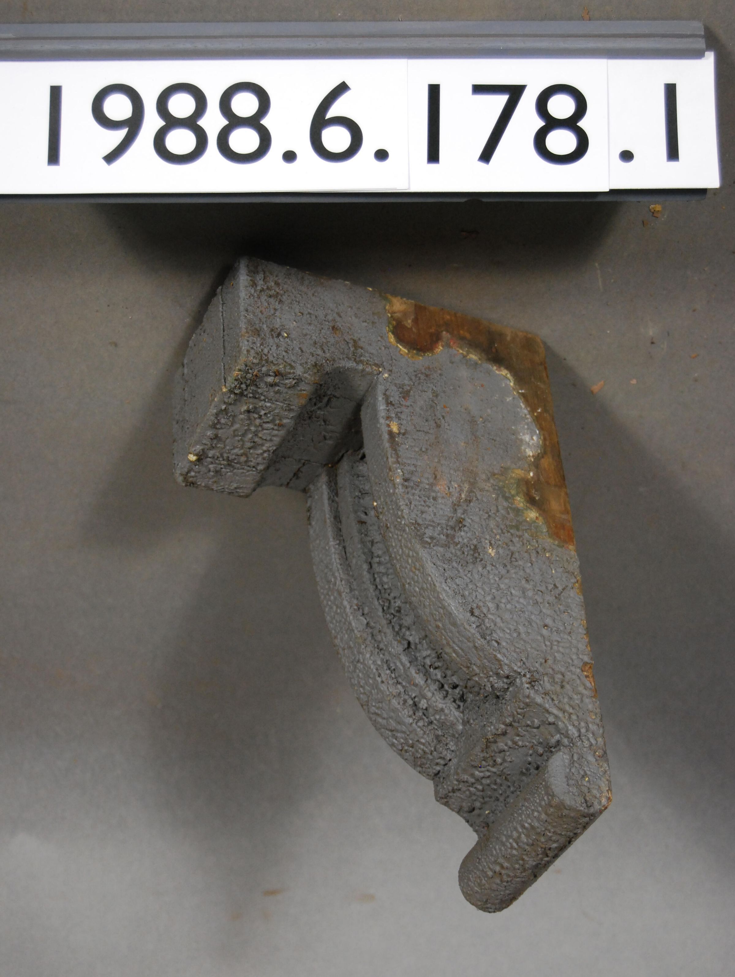 Wood bracket. Compound contour. Partially fluted front. Painted grey Inscriptions or Markings: Manufacturer: Place of Manufacturer: Design motif: Style: Finish: Painted
