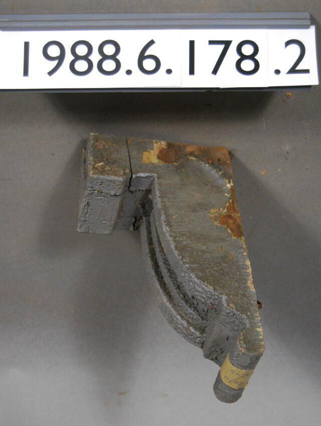 Wood bracket. Compound contour. Partially fluted front. Painted grey Inscriptions or Markings: Manufacturer: Place of Manufacturer: Design motif: Style: Finish: Painted