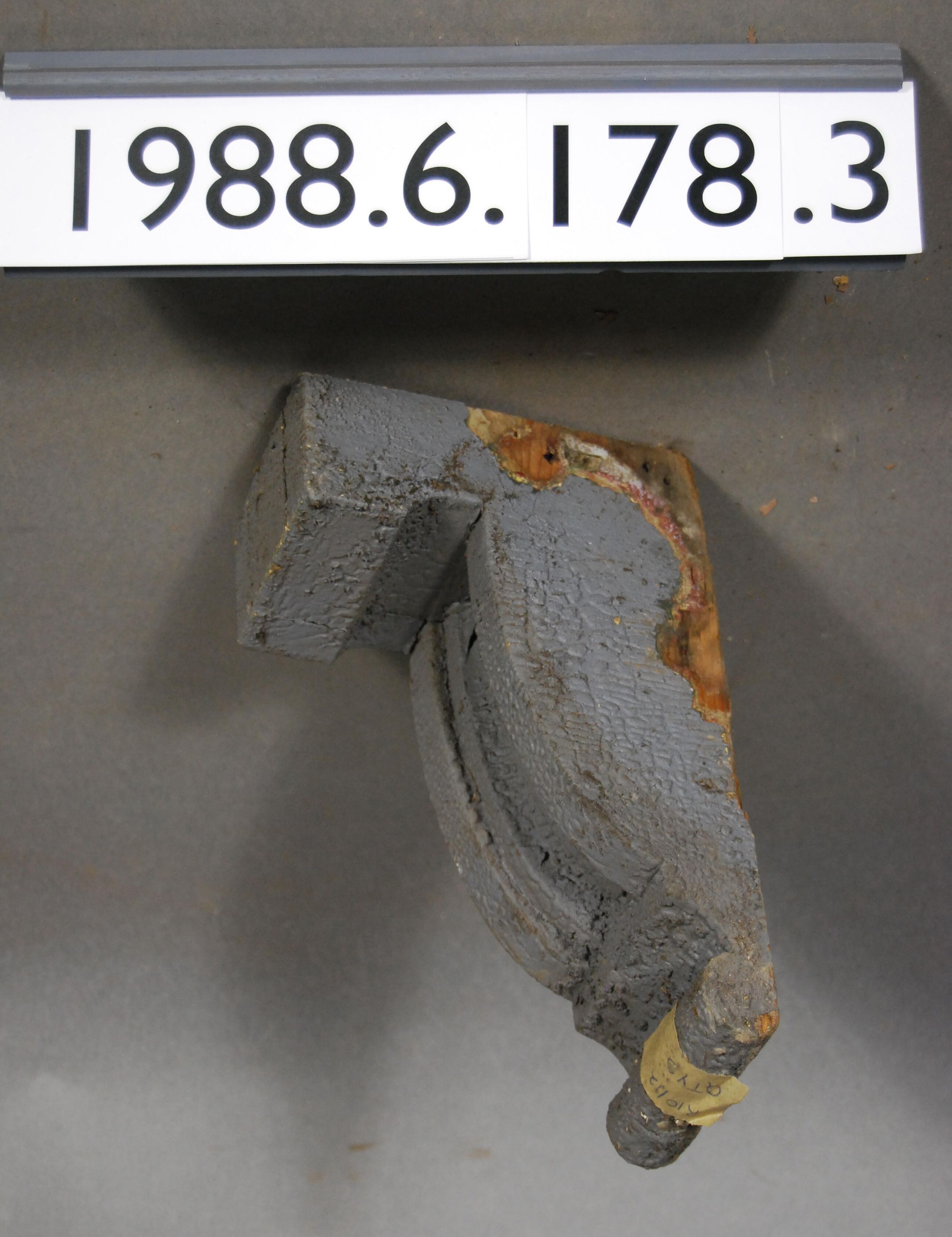 Wood bracket. Compound contour. Partially fluted front. Painted grey Inscriptions or Markings: Manufacturer: Place of Manufacturer: Design motif: Style: Finish: Painted