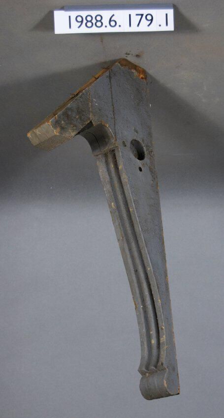 Wood cornice bracket. Angled top. Ornamental round holes at each respective side. Compound contour. Partially fluted front. Painted grey Inscriptions or Markings: Manufacturer: Place of Manufacturer: Design motif: Style: Finish: Painted