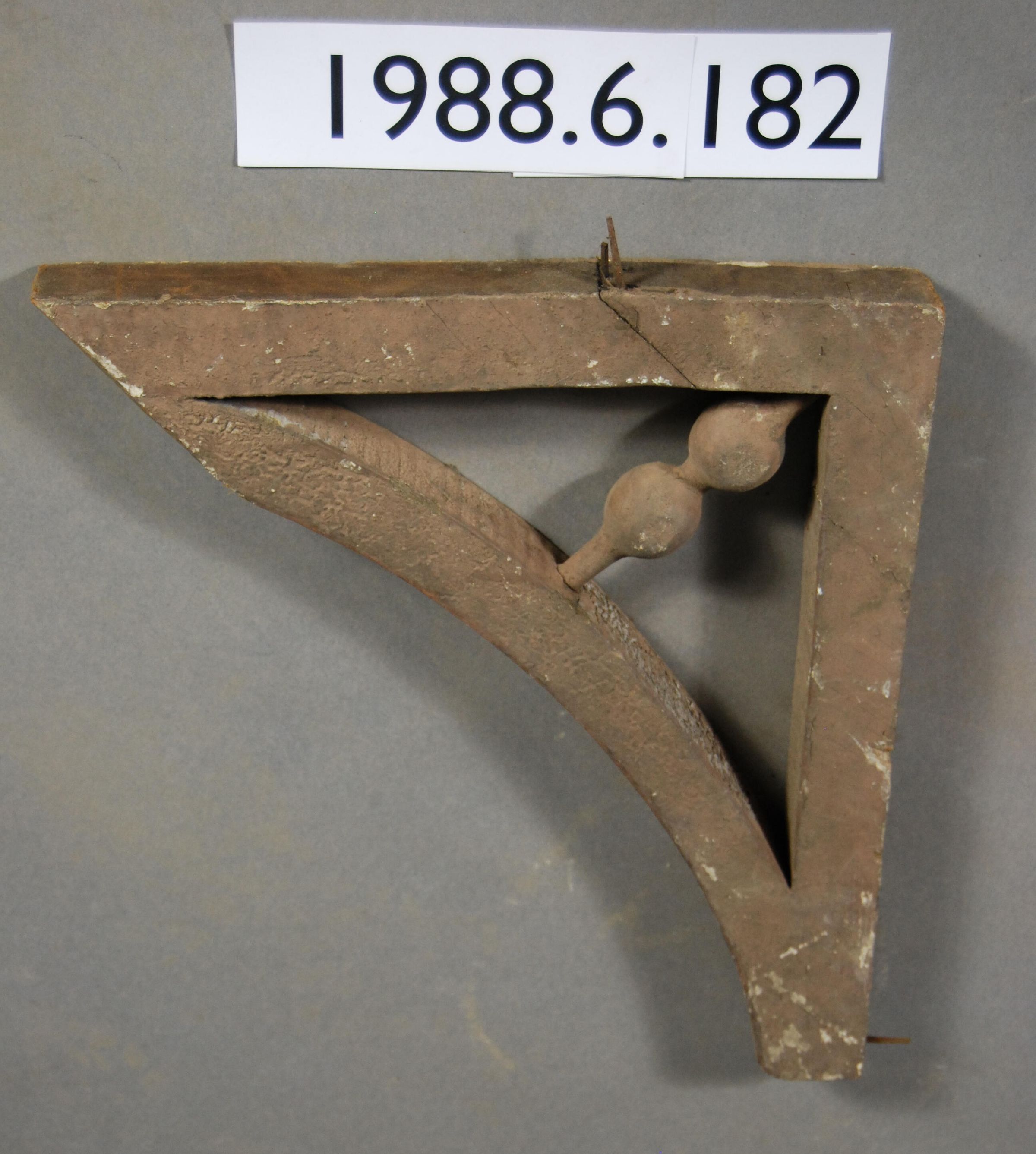 Exterior wood bracket. Curved contour. Cut from single block. Angular cut-out at sides with single spindle. One end is truncated. Painted brown. Inscriptions or Markings: Manufacturer: Place of Manufacturer: Design motif: Style: Finish: Painted