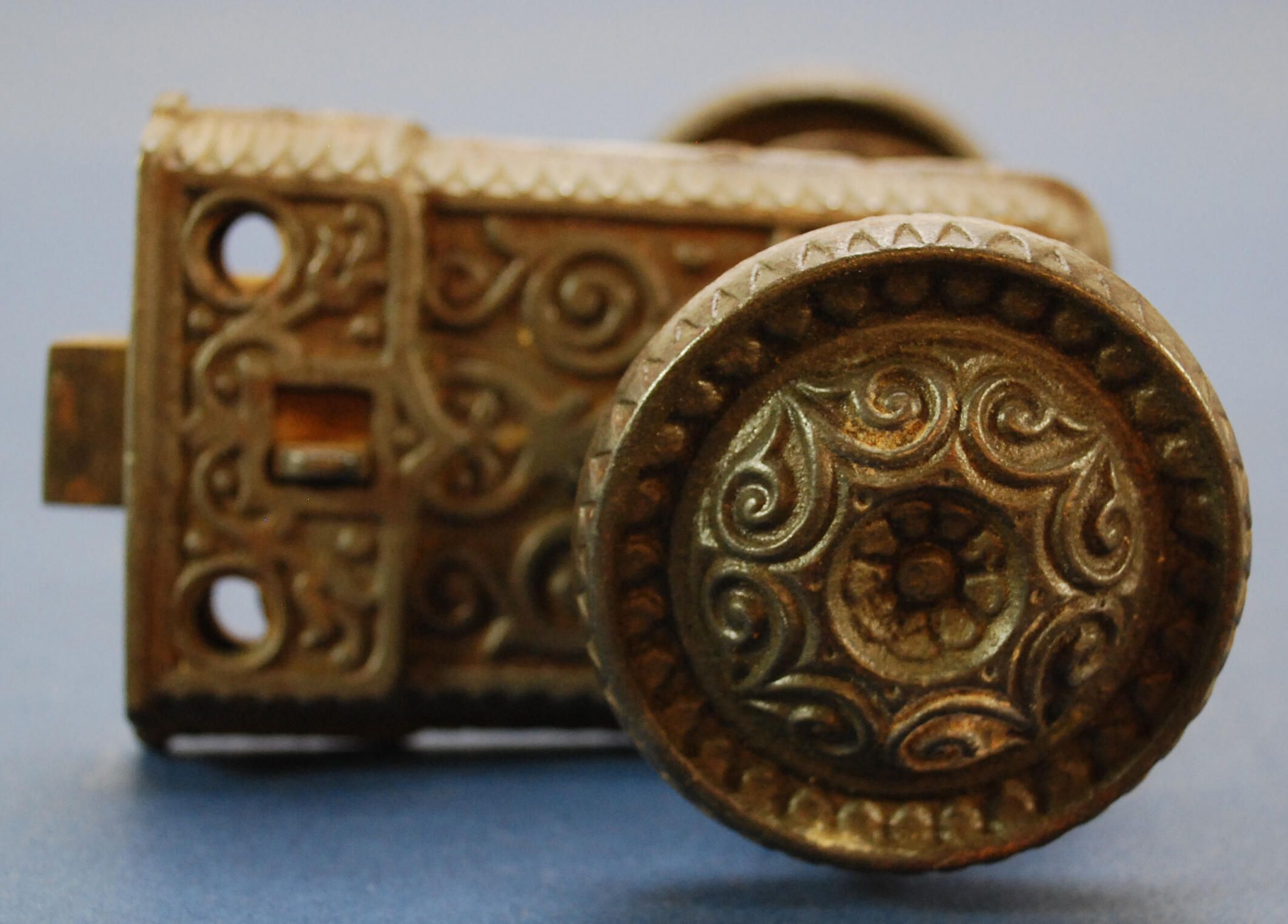 Comments: Remnants of brown finish; includes lock, pair of doorknobs, and one rose for screen door.Lexicon